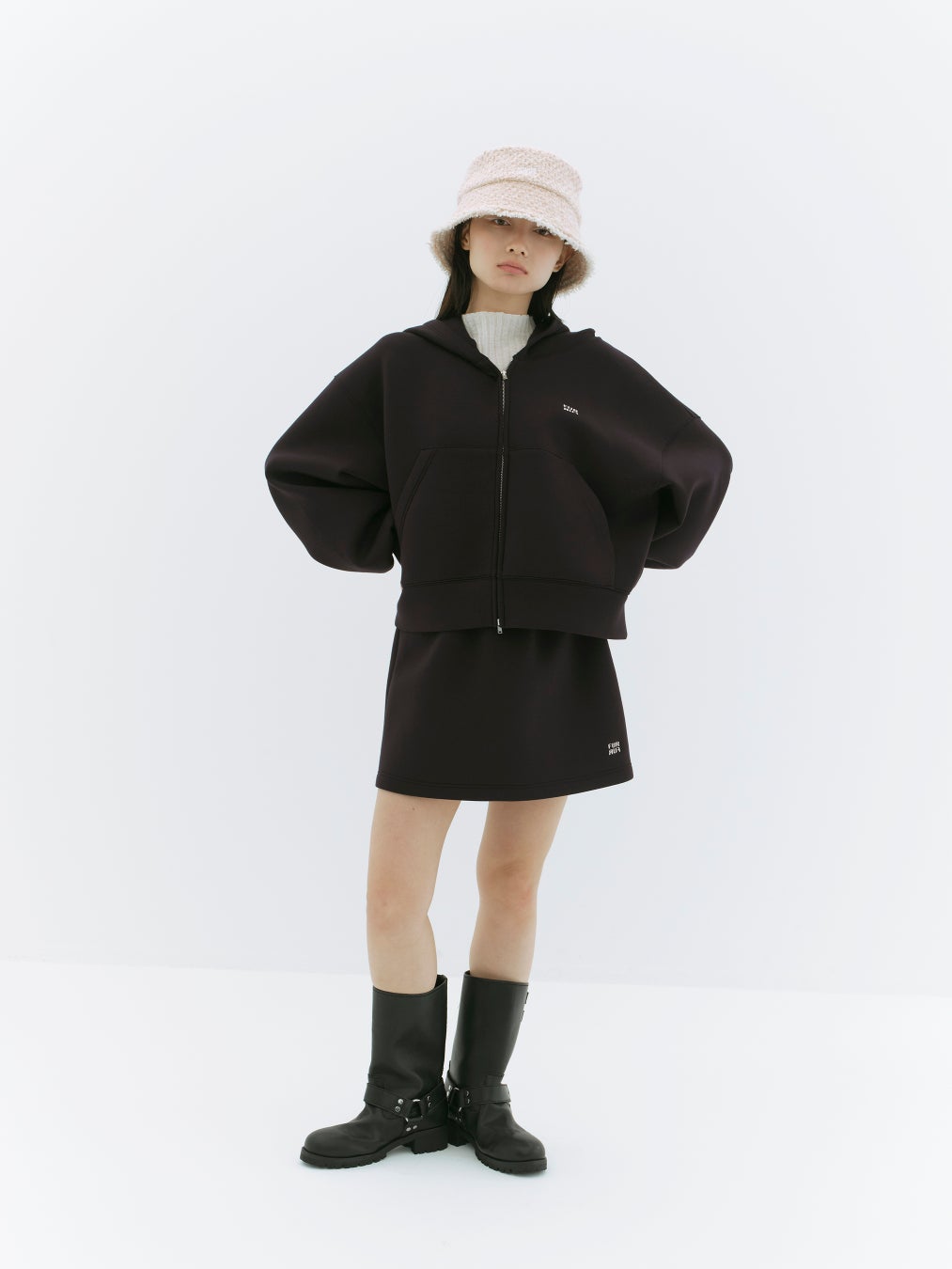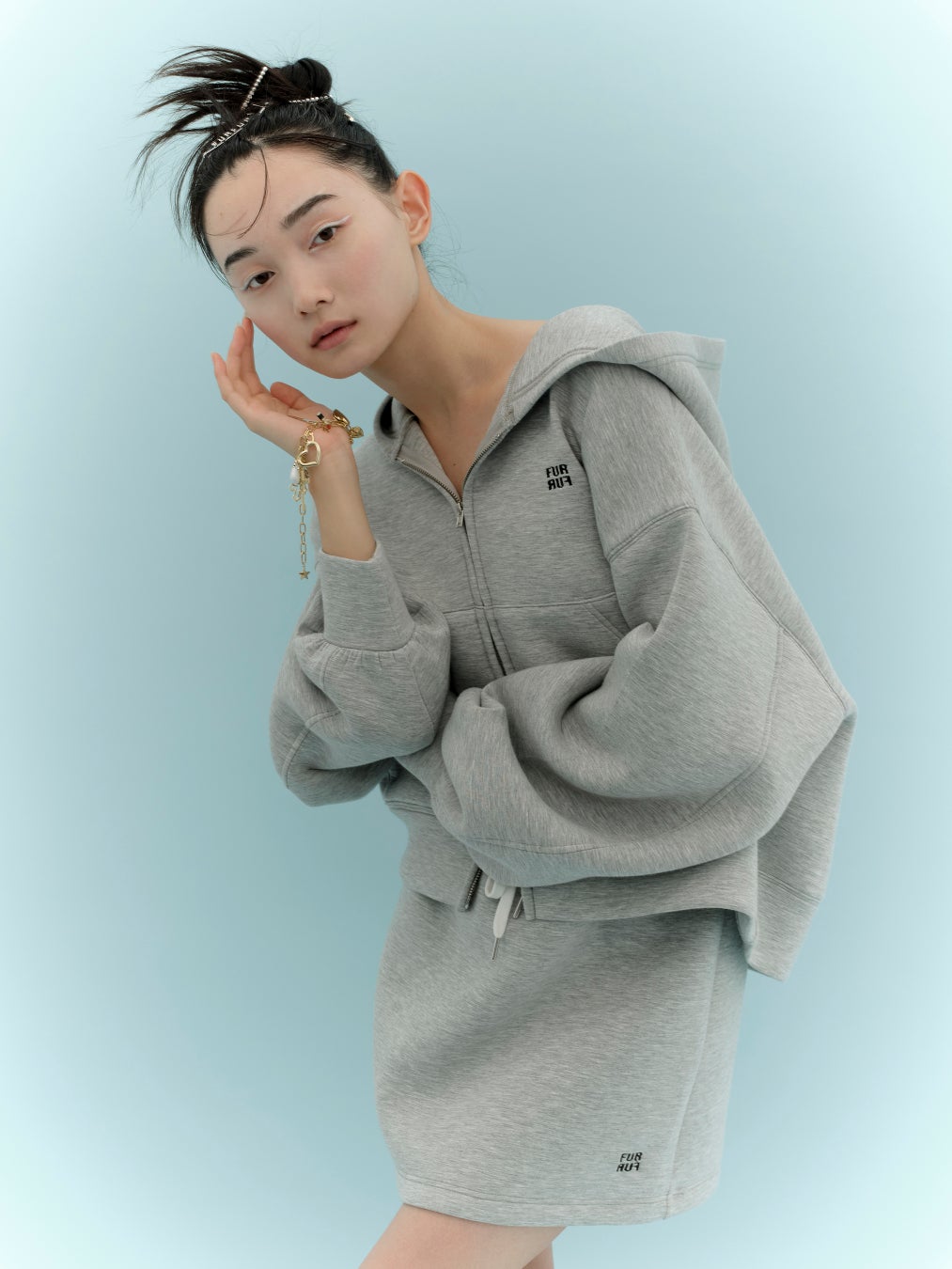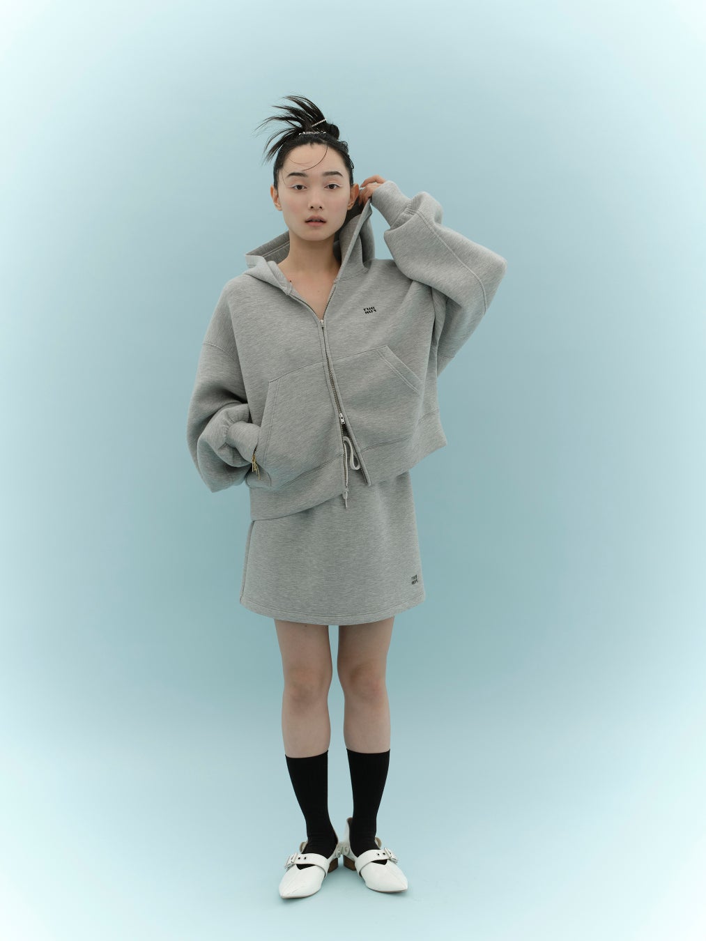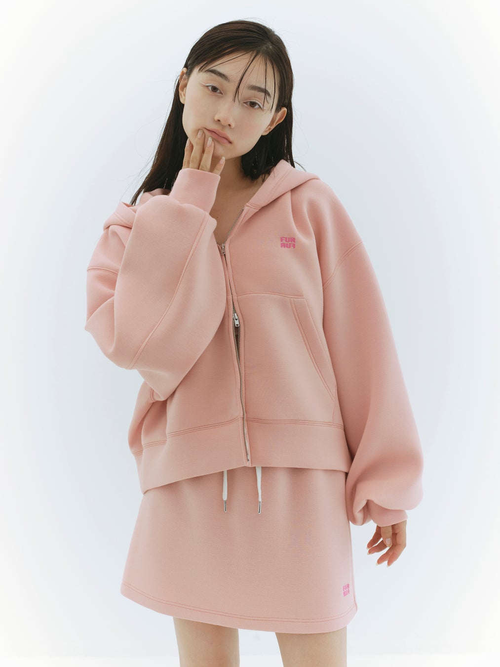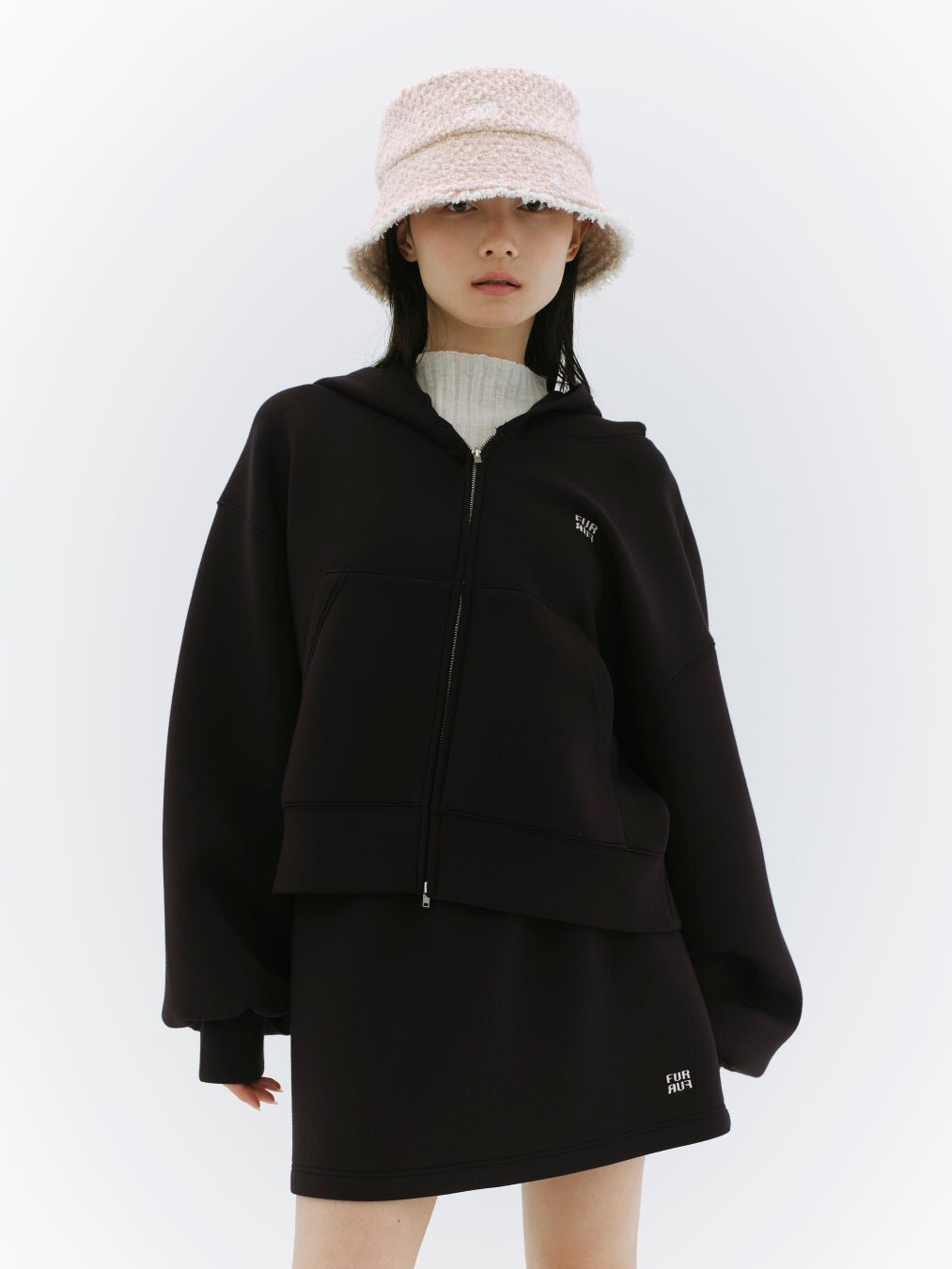 ワイドなシルエットでリラクシーな着心地のジップアップフーディーと、コンパクトなミニスカートがセットになった“今”しか買えない特別なアイテム。