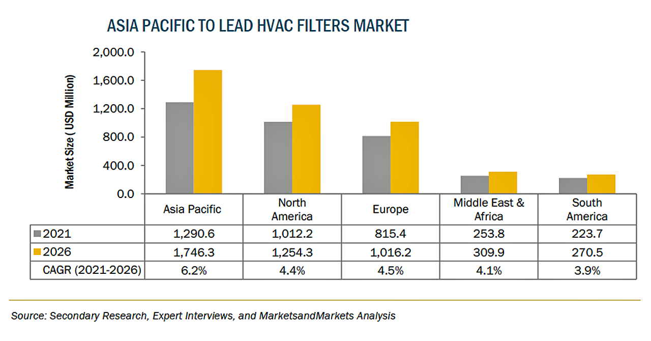 HVACフィルターの市場規模は、2021年の35億米ドルからCAGR5.0%で成長し、2026年には45億米ドルに達すると予測されています。同市場の成長の要因には、HVACシステムの需要の増加、室内空気の質に対する意識の高まり、効率的なろ過のための政府の規制や政策が挙げられます。さらに、建設部門への投資の増加とHVACフィルターの技術的進歩は、メーカーに大きな成長機会を提供すると予想されます。