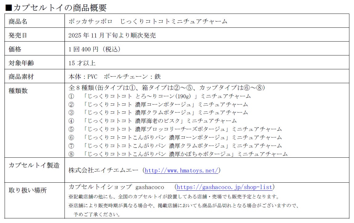 サッポロホールディングス(株)のグループ企業である、ポッカサッポロフード&ビバレッジ株式会社(代表取締役社長:佐藤雅志、本社:愛知県名古屋市)は、1996年の発売以来、長年お客様からご愛顧いただいている「じっくりコトコト」ブランドから、8種類のミニチュアチャームを展開します。ミニチュアチャームは全国のカプセルトイ取り扱い店にて2025年11月下旬から順次販売されます。
