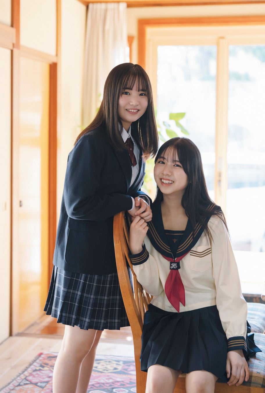 表紙を飾るのは日向坂46・正源司陽子&藤嶌果歩。表紙に採用されたのは、セーラー服をまとった2人が仲睦まじく身を寄せ合うカット。まだ少し肌寒さが残る中での撮影で、正源司が藤嶌に抱き付いた瞬間を切り取っており、2人の唯一無二の関係性が表れているなんとも愛らしい表紙となった。一方、裏表紙を飾るのは櫻坂46・的野美青&向井純葉。裏表紙には、ネクタイが印象的な都会の女子高生を思わせる制服を着てこちらを見つめるカットが採用された。高校生という限りある時間の儚なさが、美しい2人によってノスタルジックな雰囲気で表現されている。
