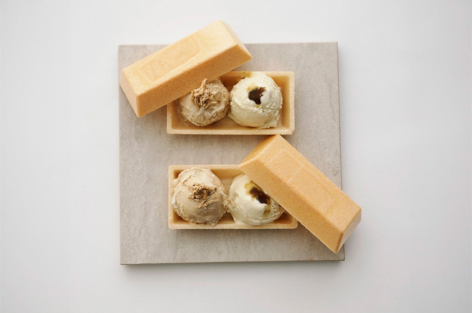 種子島産の黒糖と黒蜜、フィリピン産のマスコバド糖とココナッツ、2種のアイスを食べ比べ。
