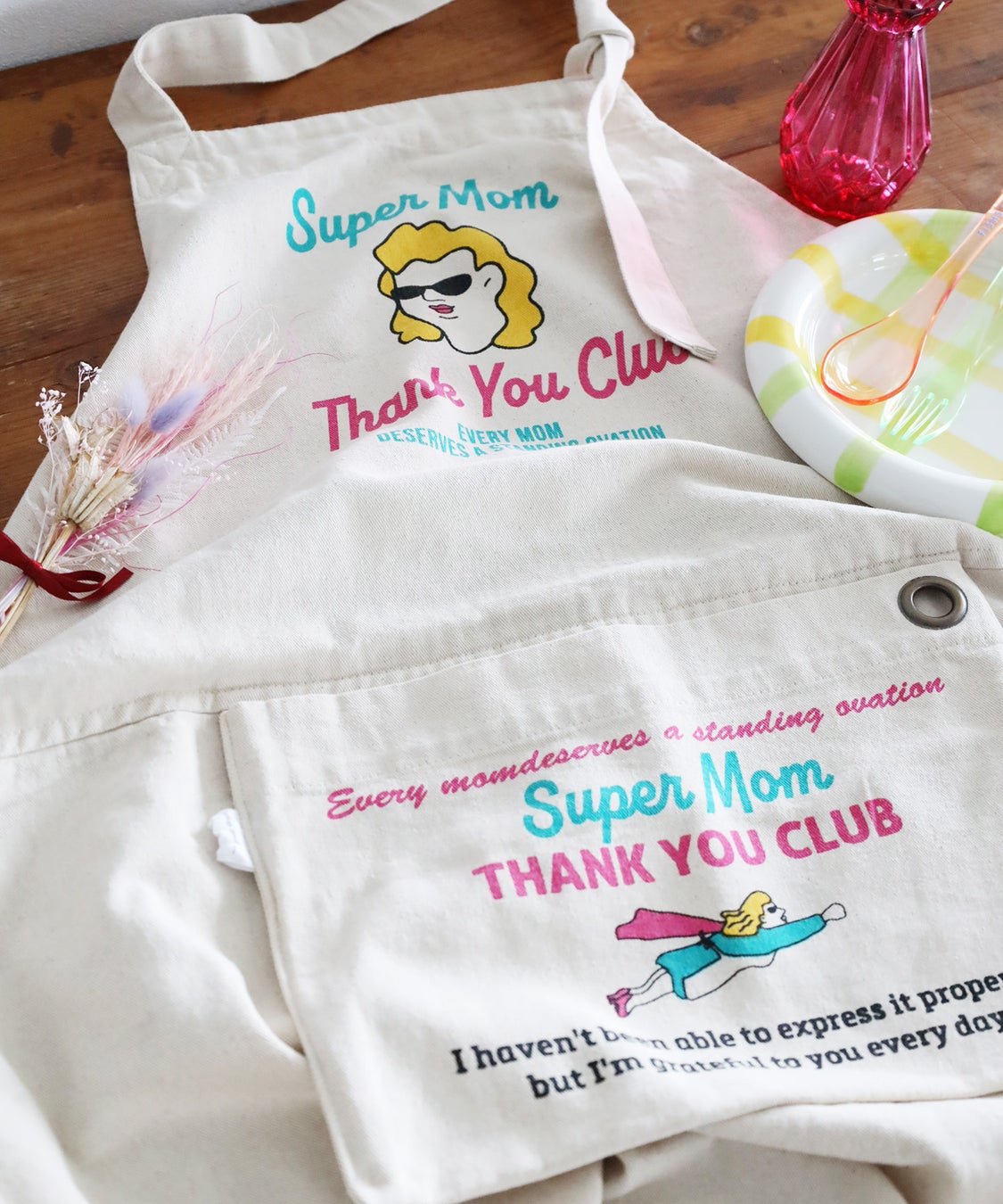 アイテムは、Super Momというオリジナルキャラクターを用いた、くすっと笑えるエプロンやポーチ、トートなどをラインアップ。また、ハンカチはいつも休みなく働くお母さんたちのお給料(!?)風の札束をデザインにしたユニークさがあふれるアイテムになっています。さらに、ビーズフラワーやデザインミラーなど、さまざまなシーンに寄り添うギフトを用意しました。特別にギフト探しをする人だけではなく、日常の買い物の中で、ふと「大切な人に贈りたい」と思えるようなアイテムとスタイルを提案します。