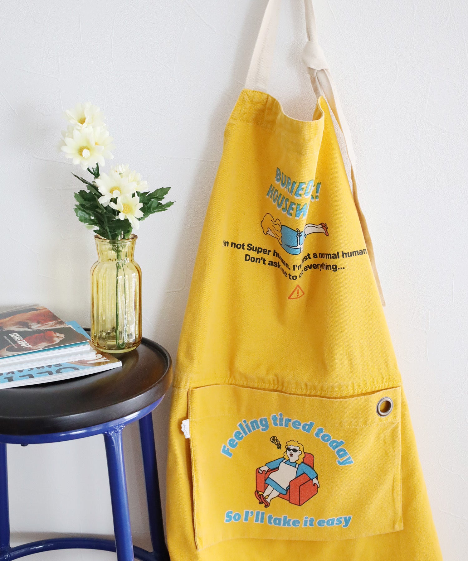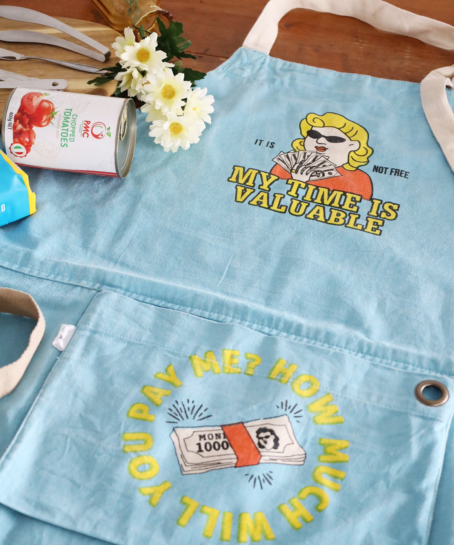 Super Momがデザインされたエプロンは、フロントの大きなポケットに畳んで入れられるパッカブル仕様で、使わないときはすっきり収納ができます。ポケットの裏側にはくすっと笑える一言が書かれていて遊び心があるのもポイント。