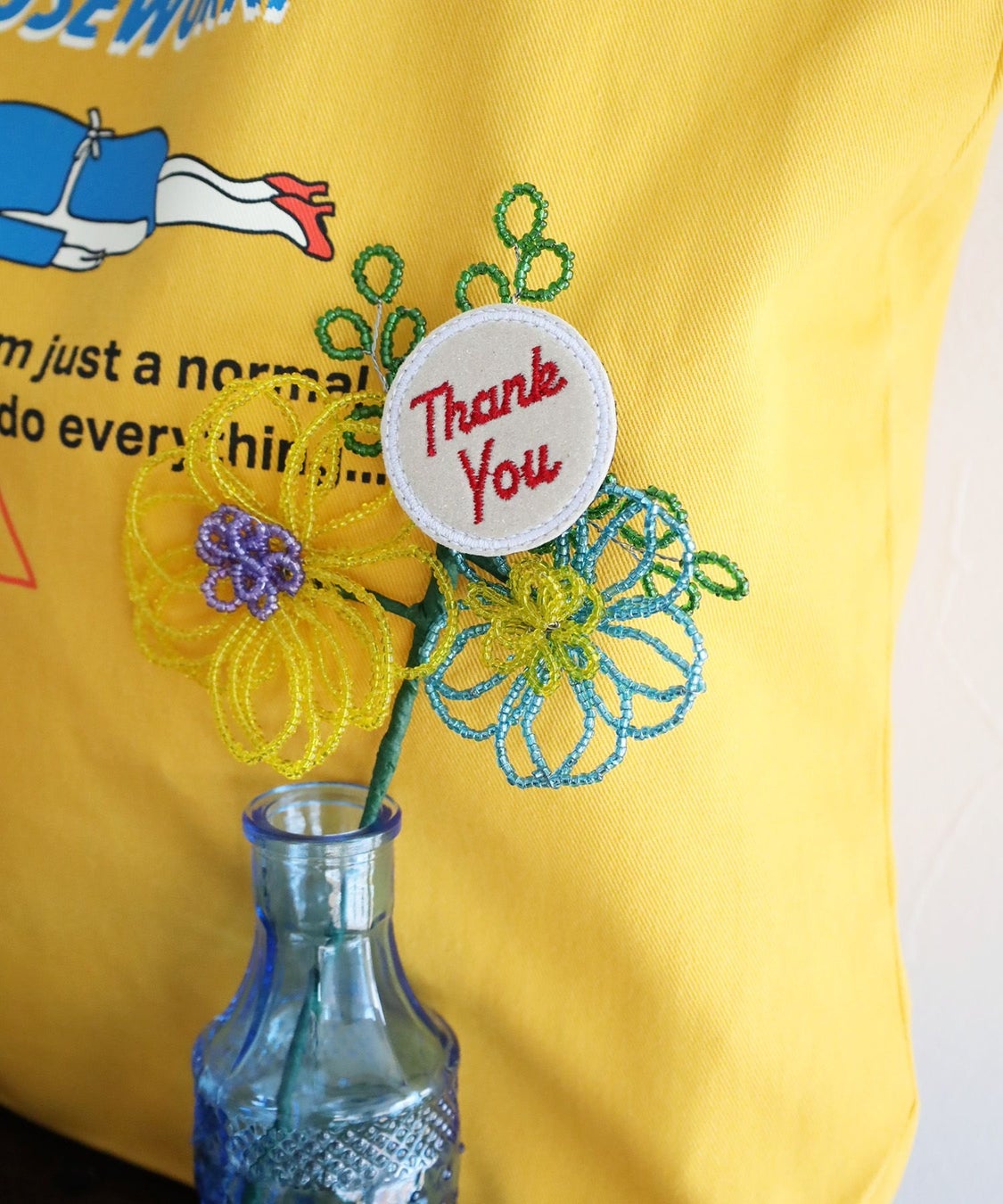 パッケージのまま飾っても花瓶に挿しても可愛いビーズフラワー。Thank youのメッセージはバッジになっているので、取り外してラッピングなどに使用しても◎