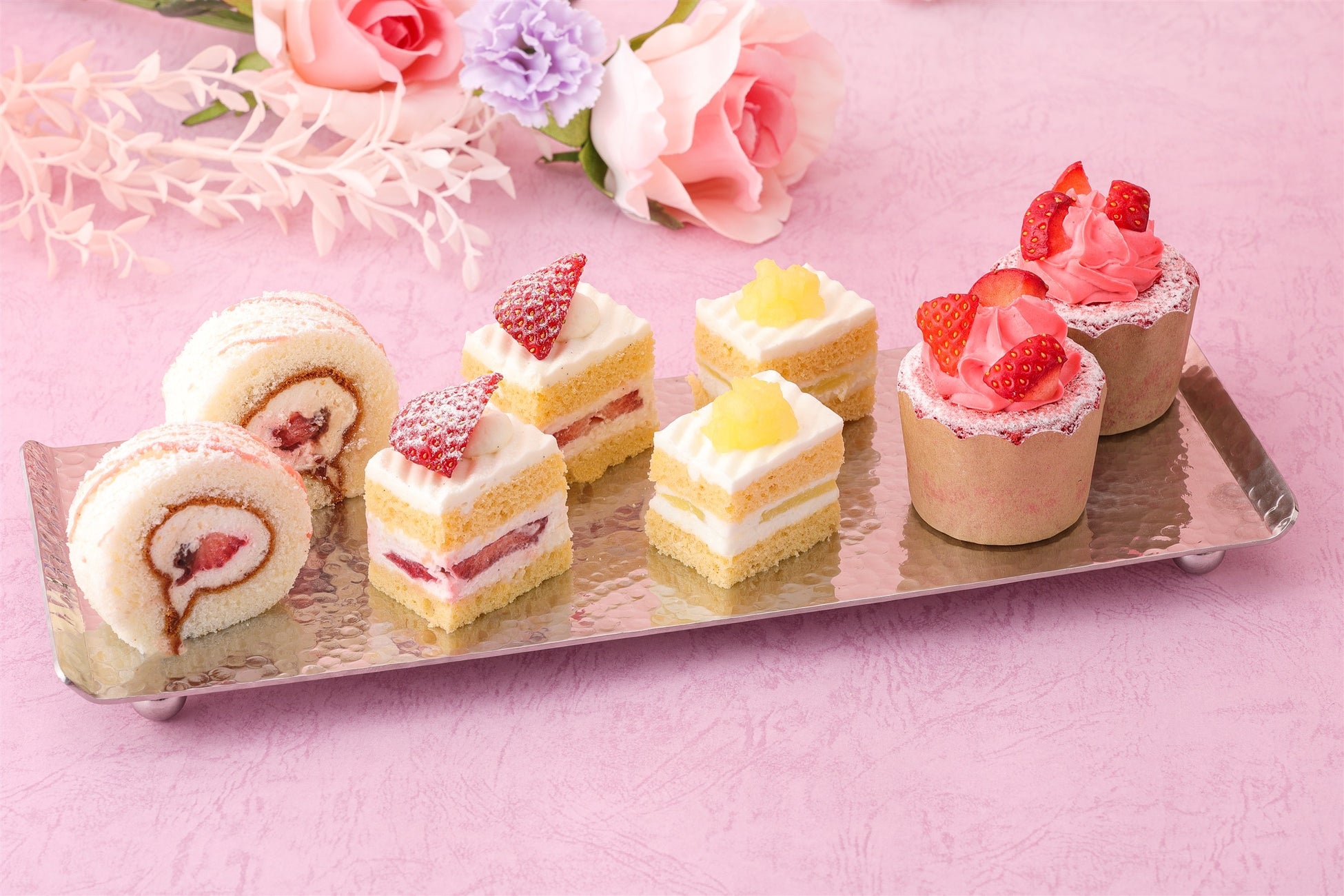 上段には食べ頃を迎えた“いちごの王様”博多あまおうを使用した「あまおうロール」やすべての材料にこだわり抜いた「スーパーシリーズ」が並びます。糖度14度以上の静岡産マスクメロンを使用した「スーパーメロンショートケーキ」に「新スーパーあまおうショートケーキ」をミニサイズでお愉しみいただけます。さらに、今回初登場のふわふわ食感の「いちごシフォンケーキ」も必見です。