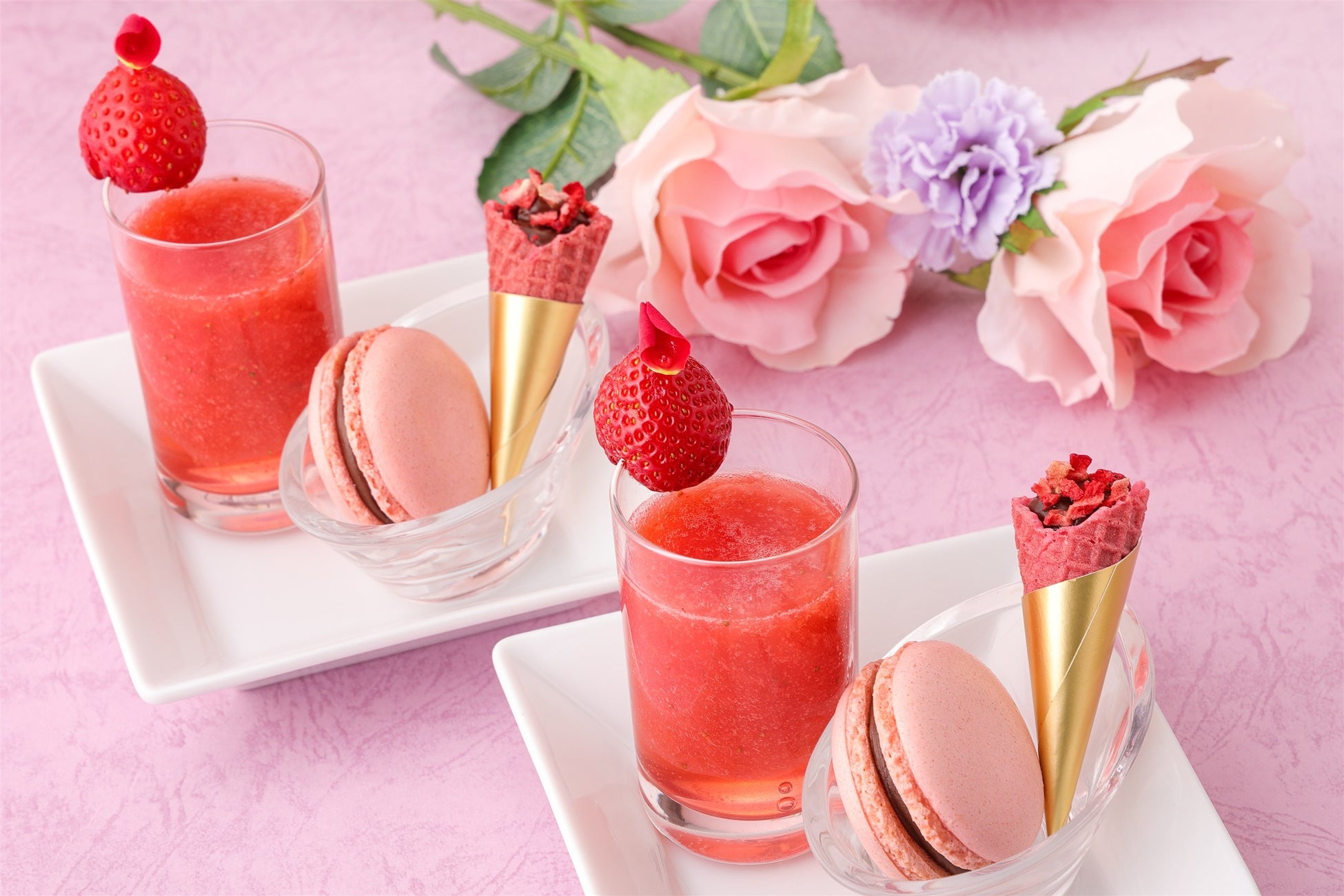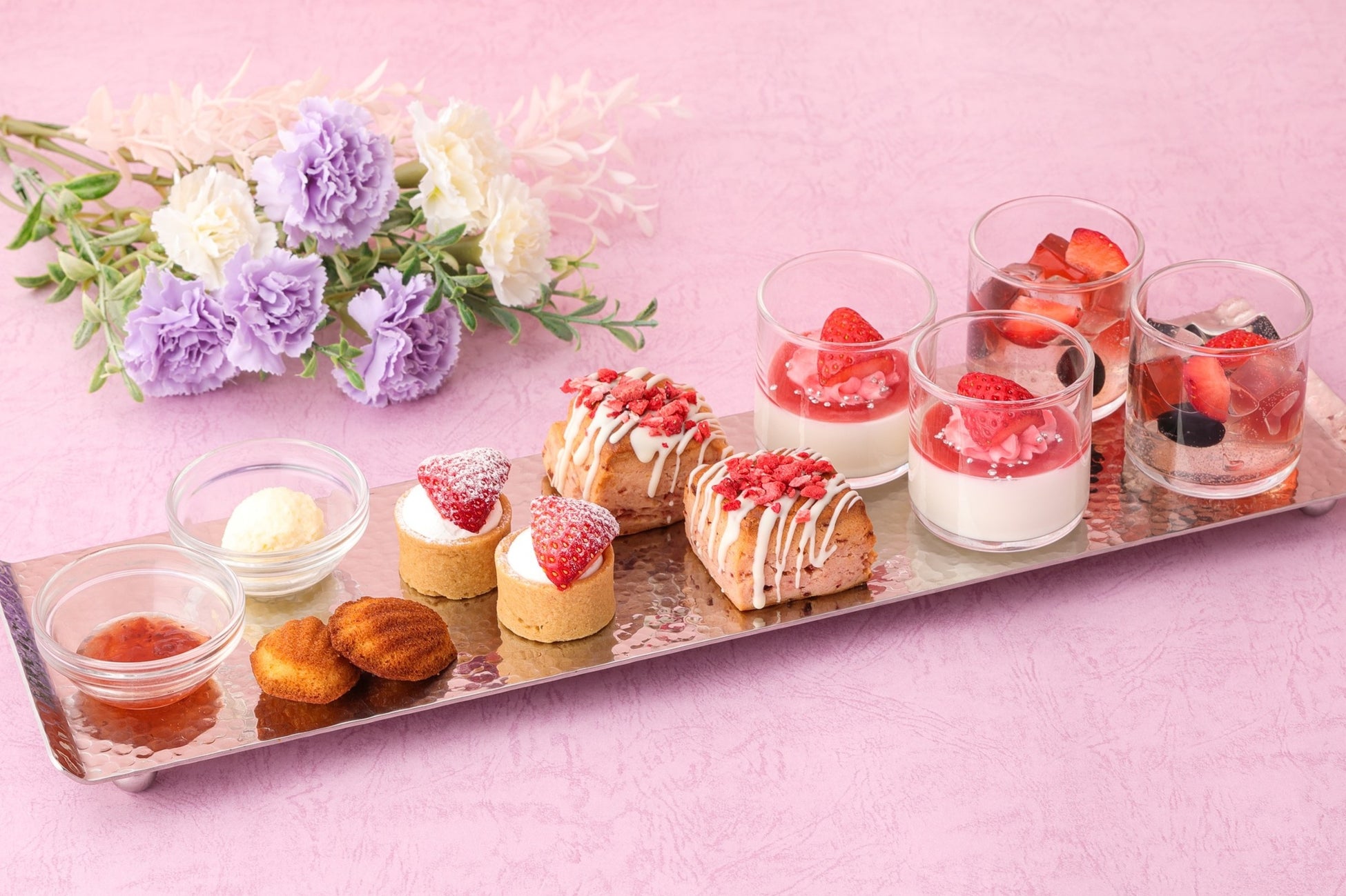 「ハーブゼリーとフレッシュいちご」、「ミニコーンストロベリーチョコ」、「いちごマカロン」がかわいく盛り付けられたスイーツアソートもお見逃しなく!