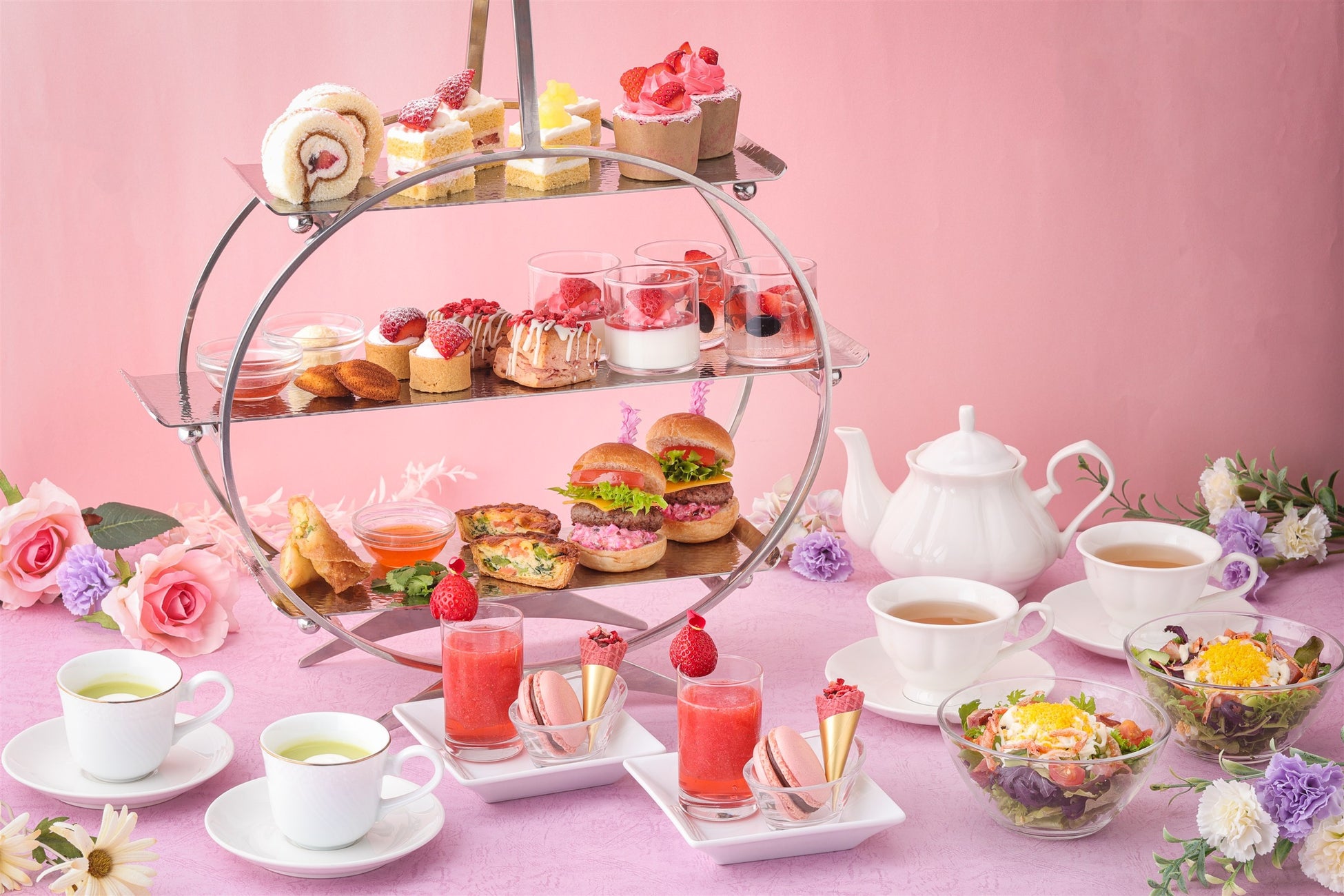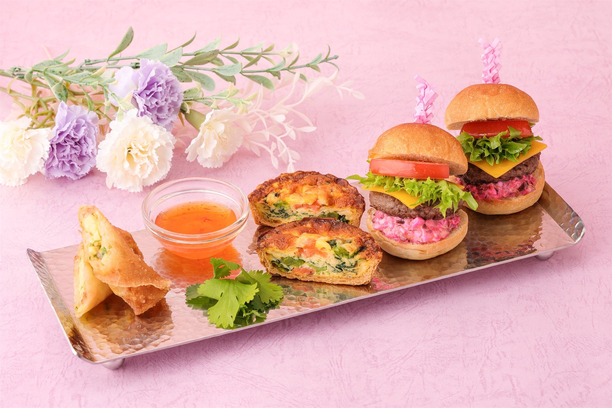 下段には、スイーツ以外にも春を感じられるセイボリーが勢ぞろい。サルサソースをディップしていただく「小海老のエスニック春巻き」に、春の彩りが広がる味わいの「スモークサーモンと菜の花のキッシュ」、和牛ハンバーグを挟みピンクのタルタルソースが目を引く「和牛スマッシュバーガー」を盛り込みました。バラエティーに富んだメニューでお食事としてもお愉しみいただけます。