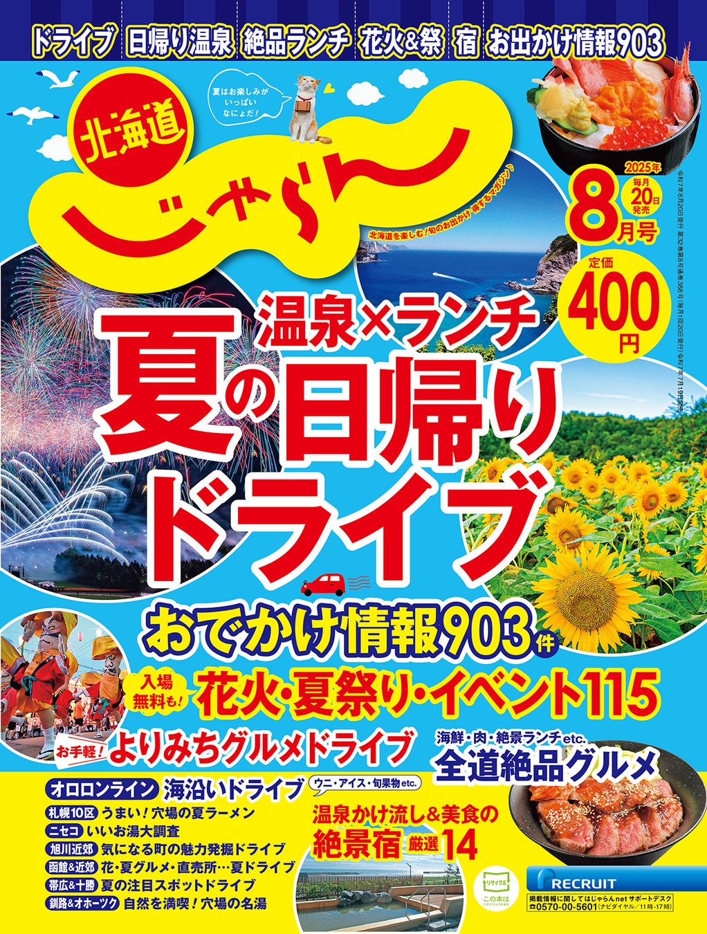 日帰り温泉&ランチお手軽ドライブ、花火大会&夏祭り&イベントカレンダー、入場無料も!夏の日帰りお出かけスポット100連発、海鮮・肉・絶景ランチetc.全道絶品グルメ大集合!、お手軽よりみちグルメドライブ、温泉かけ流し&美食自慢が勢揃い!絶景の湯宿 厳選14、発表!一度は泊まりたい北海道内の人気宿 厳選12…など今月も旬の情報が満載です。ぜひご覧ください。