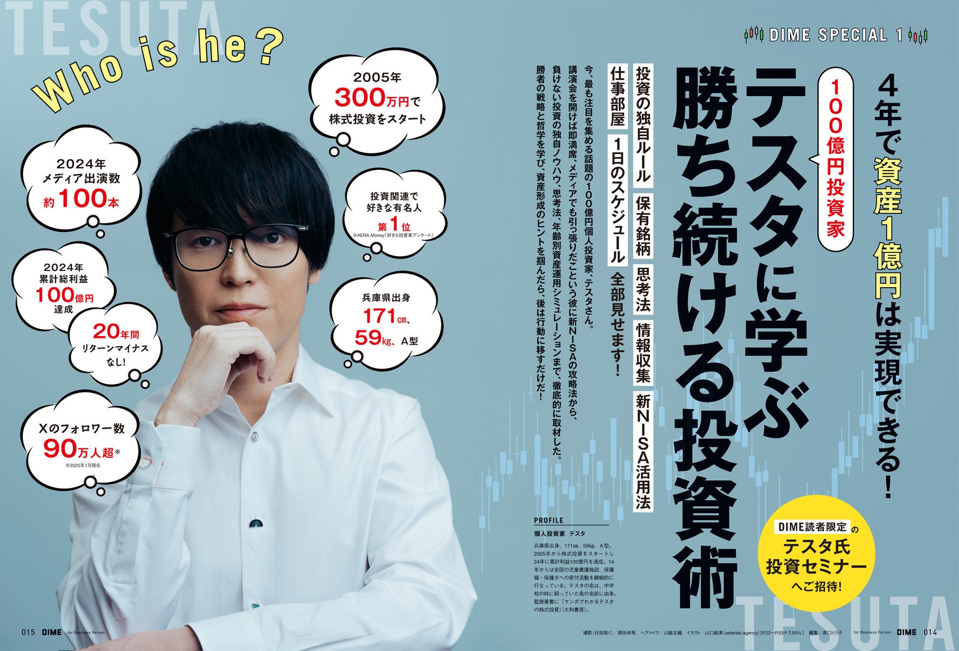 2005年に株式投資をスタートし、2024年に累計総利益100億円を達成したテスタさんは元手100万円程度でも、しっかりと順序立てて投資を行なえば誰でも努力次第で4年後に資産1億円達成は可能だと言います。にはかには信じがたい、夢のような話ですが…どうすればいいのか? そこでDIMEはテスタさんにそのノウハウを徹底取材。新NISA2年目の投資戦略から負けないための思考法、テスタさん自身の保有銘柄、ポートフォリオまで大公開! 勝者の勝ち続ける投資法に学ぶ、保存版の大特集となります。