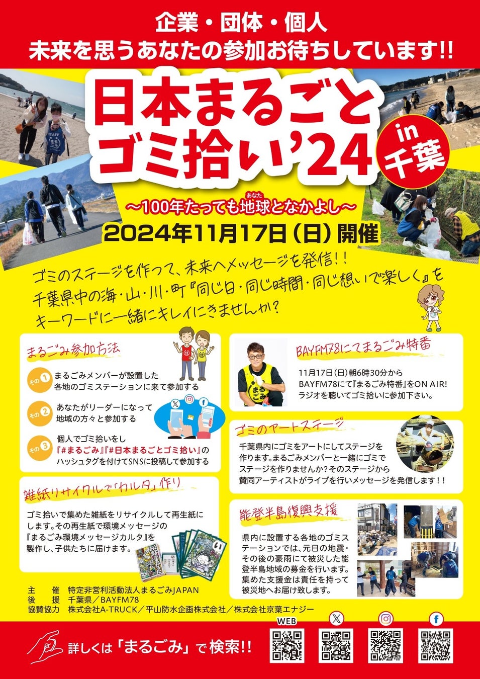 LOVE OUR BAY! 海ごみゼロ! プロジェクト(一般社団法人 SAVE OUR BEAUTIFUL OCEAN)では、11月17日(日)、特定非営利活動法人まるごみジャパンと連携して【「日本まるごとごみ拾い’24㏌千葉」~100年たっても地球(あなた)となかよし~】を開催します。