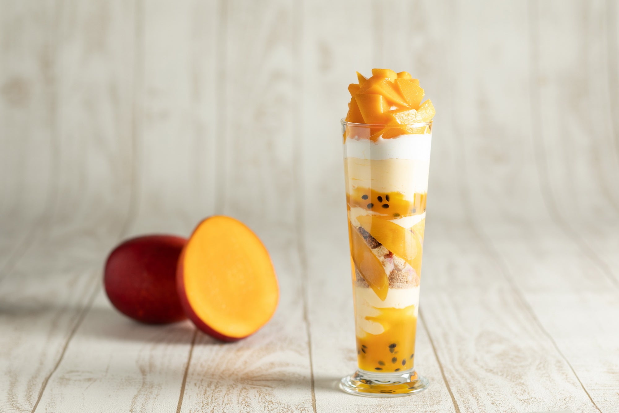 季節ごとにメニューが変わる夜間飛行のパフェは、宮崎マンゴーとマスクメロンの2種類を提供。最後まで美味しく召し上がっていただけるよう、食感やソースのアクセントにもこだわった10層仕立てのパフェです。