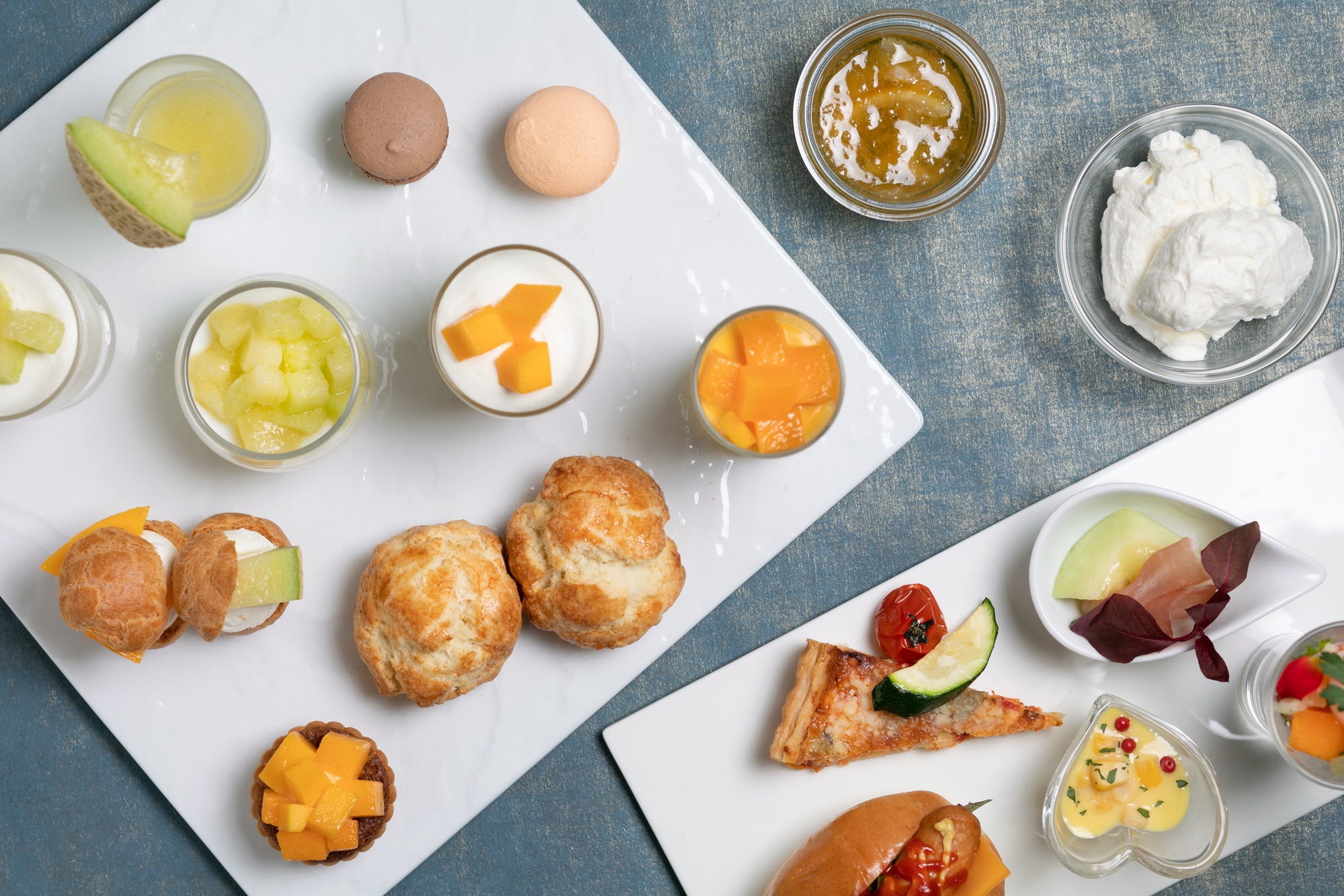 アフタヌーンティーでは、果物の王様としてマスクメロンの中でも最高峰と称され、上品な香りとジューシーな果汁が味わえる「静岡産クラウンメロン」を使用。風味豊かでなめらかな口どけのブランマンジェに、果肉感をそのまま味わっていただけるようクラウンメロンをトッピングした「クラウンメロンのブランマンジェ」や、追熟したメロンのみで作った「クラウンメロンのスープ」などが楽しめます。その他、とろけるような果肉と濃厚な味わいが堪能できる「宮崎産完熟マンゴー」を使ったグラスデザートやタルトなど、全16品のスイーツとセイボリーがお楽しみいただける贅沢なメニューです。