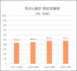 一方で、日本における乳がん等の検診率は先進諸国の中で極めて低い位置にあるのが現状(*2)で、健康診断・人間ドックの未受診率も全世代で男性より高く、40~60代女性の乳がん検診の受診率は40%台から約10年変化はなく、未受診が60%近くに上ります。(図1) その要因には、女性が日々仕事や家族のために奔走し、つい自分のことを後回しにしてしまう状況や、検診やヘルスケアなど自分に必要な情報が浸透していないこと、検査に対しての不安などが原因として考えられます。(図2)