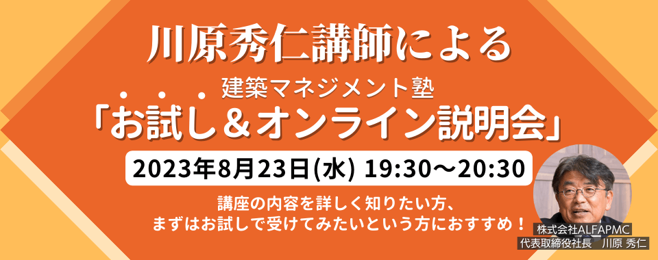 8/23(水)建設・建築マネジメントのエッセンスが分かる「建築マネジメント塾」のお試し&オンライン説明会開催 ~ 9月の開講コース受付中!~