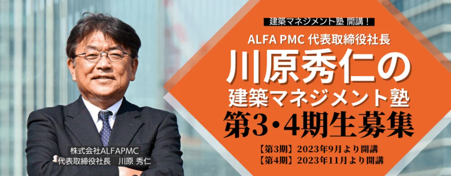 「建築マネジメント塾」は、建設・建築マネジメントの第一人者である株式会社ALFA PMC代表取締役社長の川原秀仁氏が、建設産業従事者の皆さまにマネジメントの濃密なエッセンスを伝えることを主目的とした全8回の有料講座です。その申し込みの前に、講座の内容・詳細や講義の雰囲気を知りたいという皆様からのご希望にお応えして、今回のお試し&オンライン説明会の開催となりました。