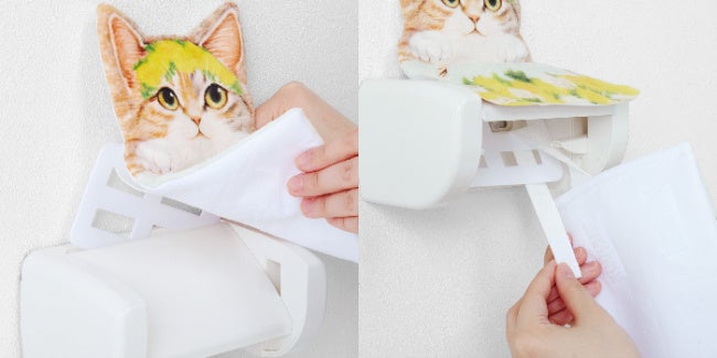 取り付け方は簡単。猫さんをペーパーホルダーとふたのすき間に差し込み、下側を引っ掛けて面ファスナーで留めて固定すれば完成です。