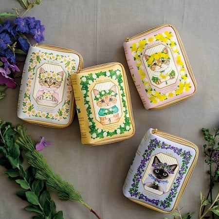 花言葉をテーマに、お花の妖精になったメルヘンな猫さんが描かれた、植物図鑑風のミニポーチです。