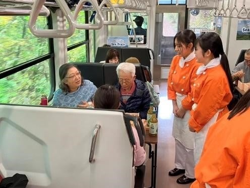 ・列車内でお弁当を食べるのが難しいかと心配していましたが、テーブルをご用意してくださり、食事を堪能できました。ありがとうございました。ガイドの冊子も読み応えがあって、ツアーコースには入っていないところにも、また改めて行ってみたいと思いました。列車に乗り込む際に電光掲示板に「海と日本プロジェクト」の表示があってテンションが上がりました。ウニの養殖所でお話を聞いて、すっかりウニを食べたい気分になったので、塩ウニ等のお土産が販売されていたらつい買ってしまうなと思いました。