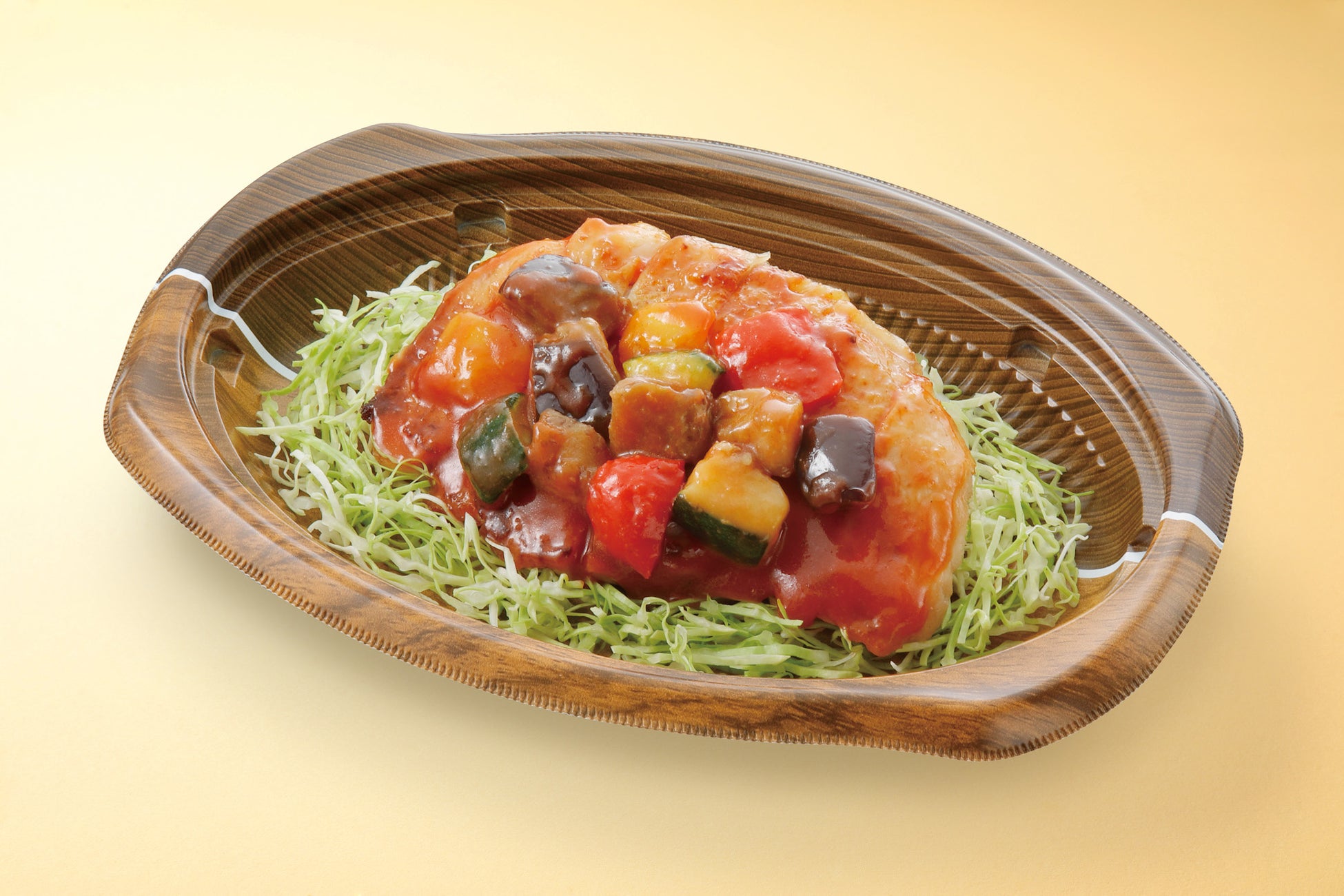 - 香ばしいグリル野菜と特製トマトソースをたっぷりかけたジューシーチキン!