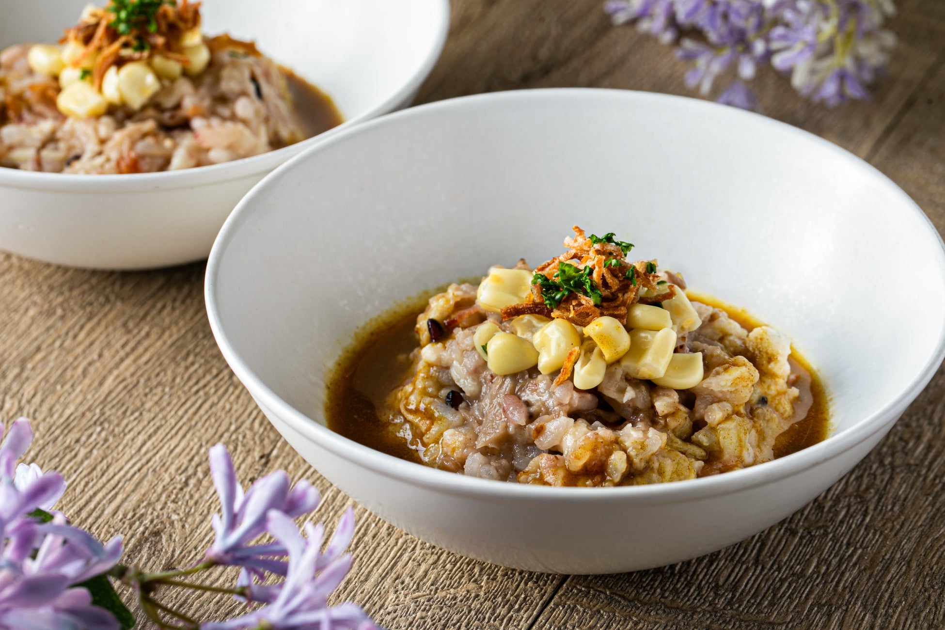 北海道産ピュアホワイトと雑穀米のパルミジャーノリゾット 北海道名物スープカレー仕立て、男爵芋のスチーム、函館名物シスコライス ケッヘル風、
