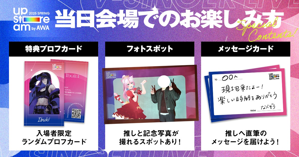 2025年3月23日(日)に人気VSingerや歌い手など10名が出演する第三回目となる『AWA UPSTREAM 2025 SPRING』をGRIT at Shibuyaで開催。本日出演者のタイムテーブルを発表いたしました。また、会場では前回も大好評だった出演者のプロフィールカードを来場者全員に配布するほか、出演者へ直接想いを届けることのできるメッセージカードや、出演者と一緒に写真が撮れるフォトスポットなどをご用意しています。チケットも残りわずかとなりましたが、気になるアーティストをチェックして、ぜひ会場まで足をお運びください。