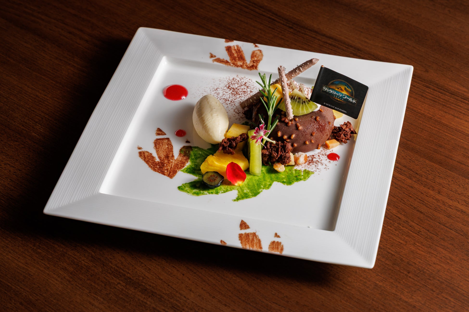 パッションフルーツのシャーベットとともに、太古の楽園をイメージしたスイーツです。恐竜たちが歩いた豊かな森を感じる、ひとくちの冒険をお楽しみください。