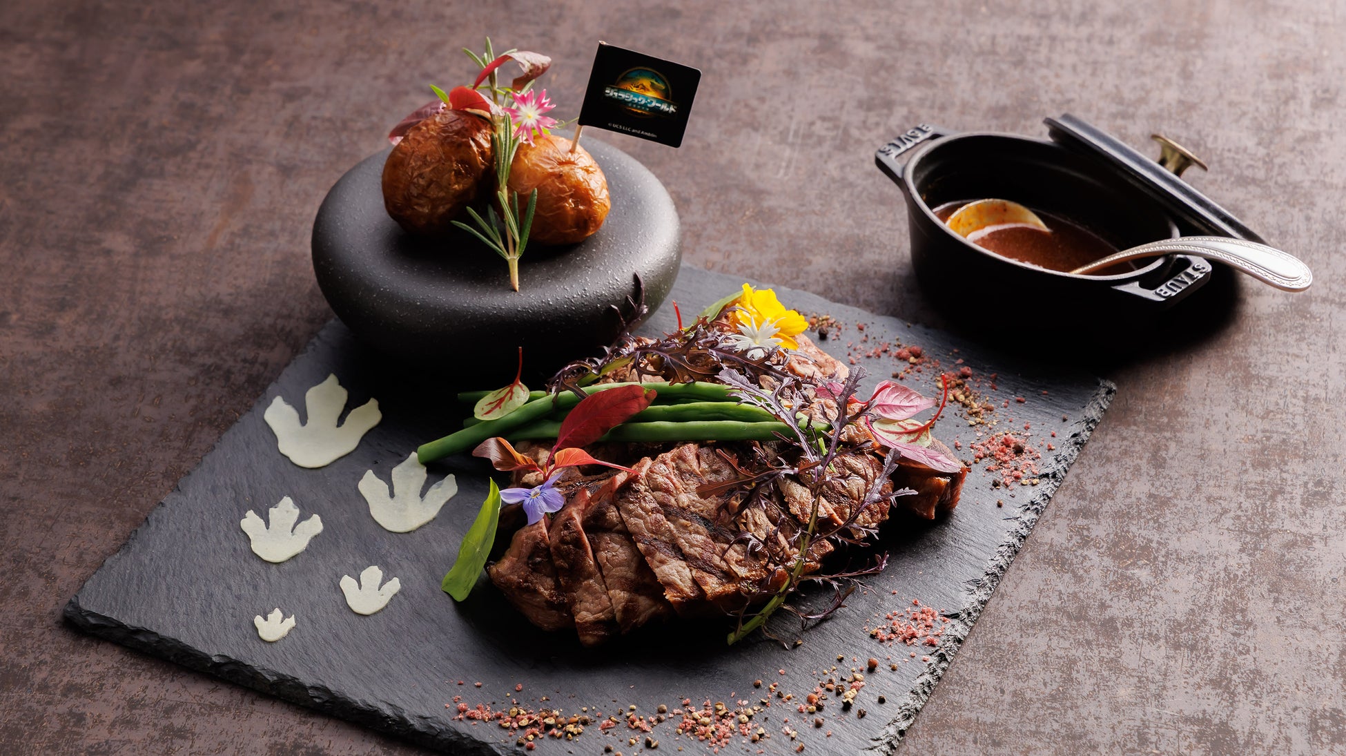 太古の岩盤を思わせる炭黒のプレートに、豪快なTボーンステーキと大地に残された恐竜の足跡。森林をイメージしたローストベジと岩石の破片に見立てた岩塩 やペッパー。時空を超えて恐竜時代を旅しているかのような気分を味わえます。