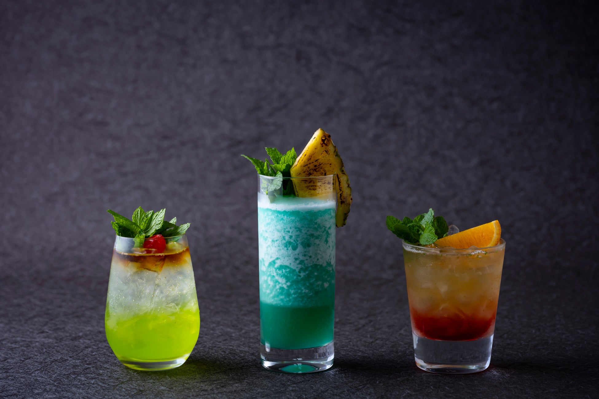 ジャングルをイメージしたカクテルや、さわやかで夏にぴったりな清涼感感じるブルーのカクテル、情熱の赤に染まる夕日が大地に沈む様子を