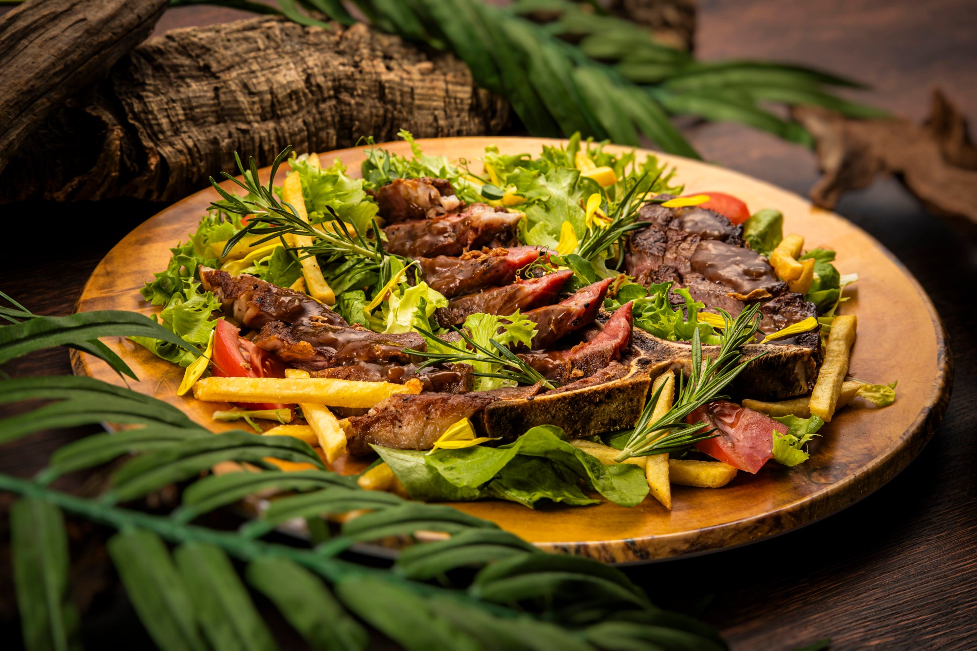 プレート一面にサラダやポテトを散りばめ、約400gのTボーンステーキで恐竜の足跡をイメージしました。王者の攻撃的なイメージからにんにくや