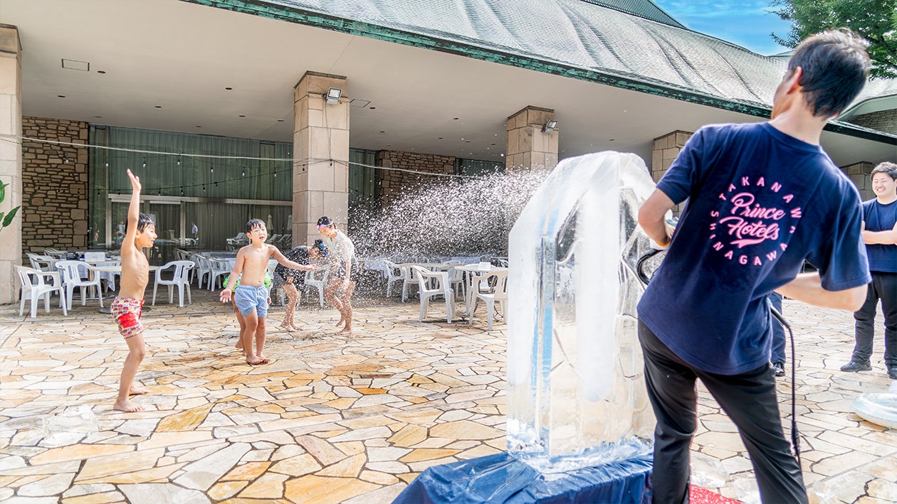 目の前で彫られた映画を連想させる氷彫刻のオブジェをプールにダイブ!