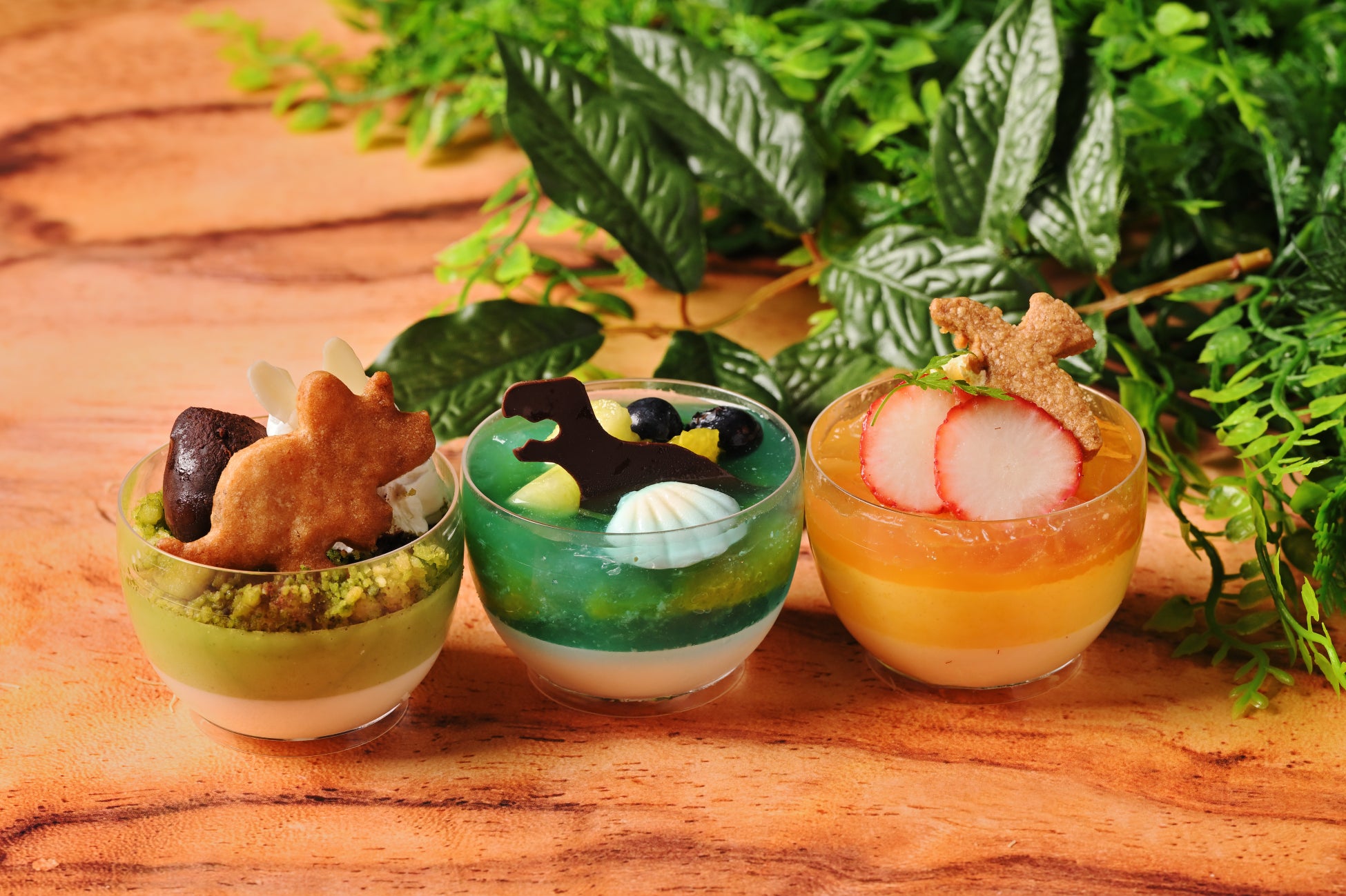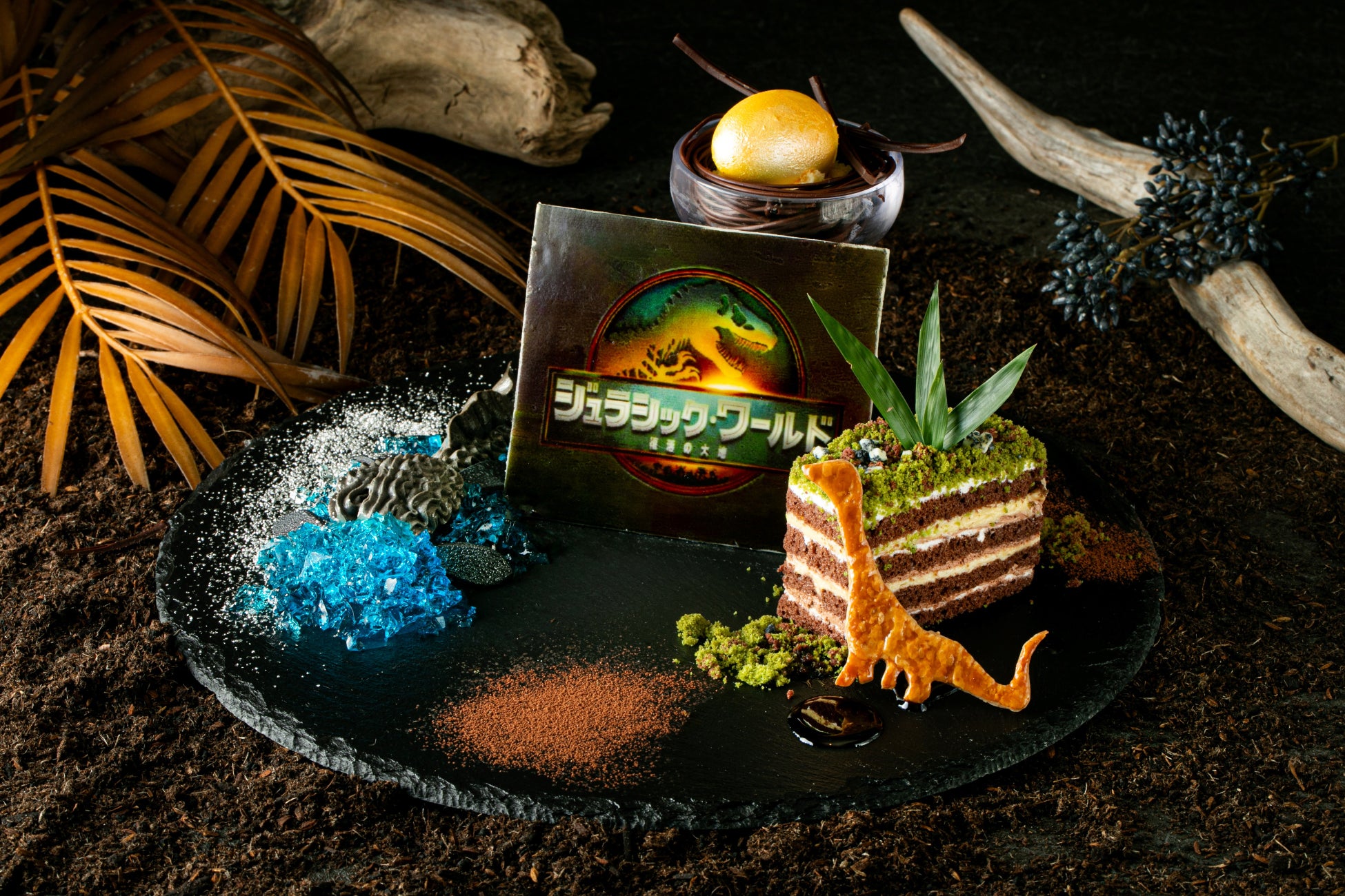 悠然と歩むティタノサウルスをかたどったパイや、ケツァルコアトルスの卵を思わせるホワイトチョコとバニラのパルフェ。海の中ではモササウルスの影を宿す黒ゴマのムースなど『ジュラシック・ワールド 復活の大地』の世界観を スイーツで再現いたしました。