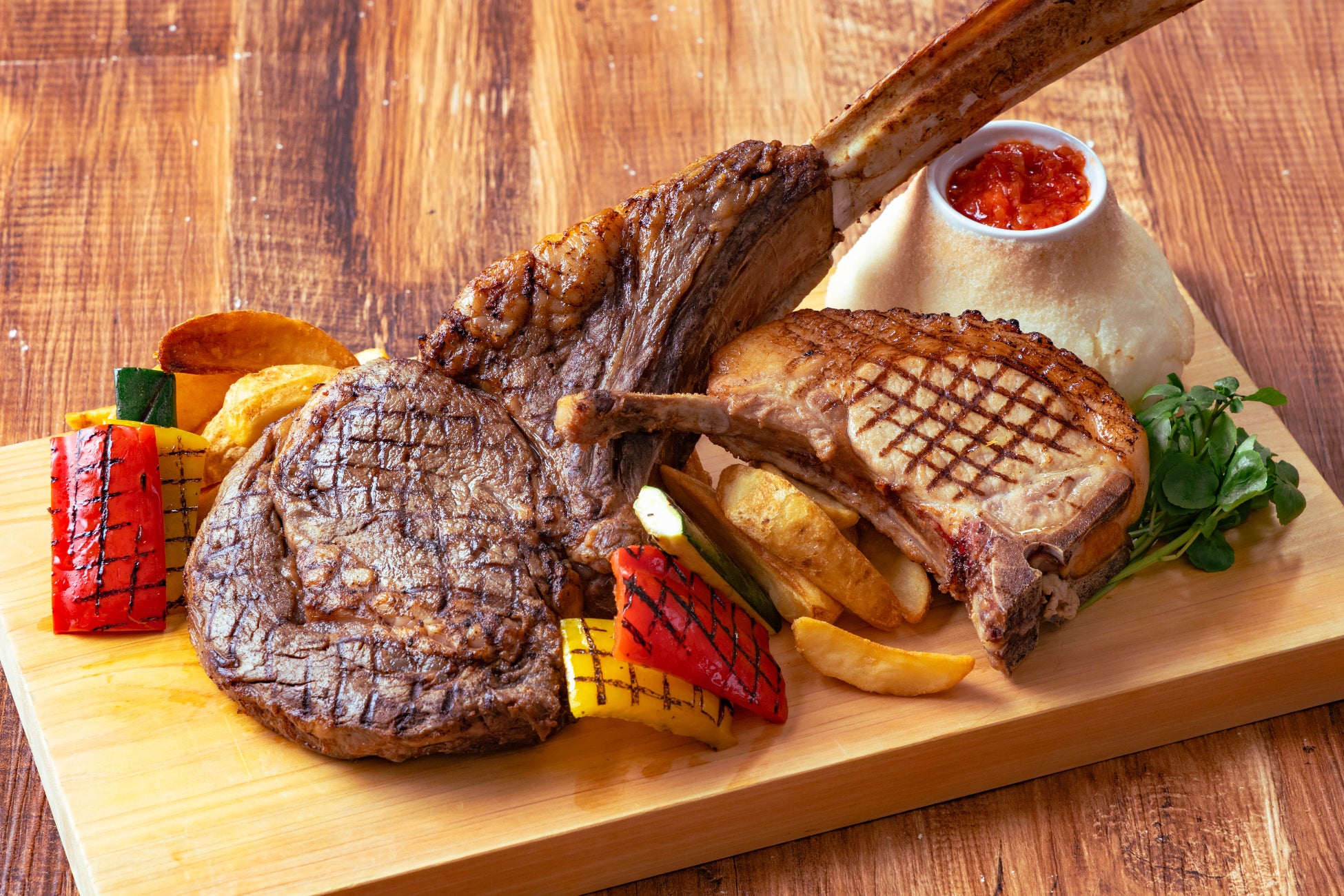 恐竜気分で豪快に味わう、トマホークと骨付き豚ロースのミートプレート。ジューシーに焼きあげたお肉を中心に、焼き野菜とフライドポテトを添えてボリューム満点に仕上げました。