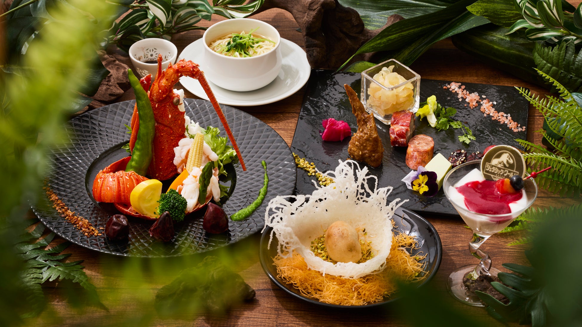 空飛ぶ恐竜を手羽先で表現した一口前菜盛り合わせやケツァルコアトルスの卵をイメージした五目揚げ餅、メインの伊勢海老(外国産)には、辛味の粉末を添えることで、辛いものが苦手な方も安心してお楽しみいただける一皿に。