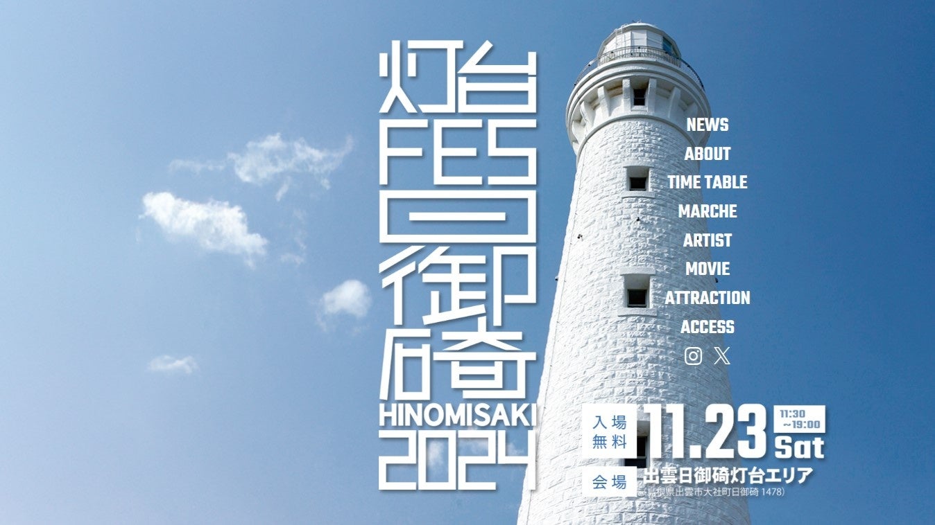 日御碕・鷺浦灯台利活用プロジェクトコンソーシアムは、日御碕の復興を目指し「上を向いて行こう!」をテーマに、2024年11月23日(土)に「灯台FES日御碕2024」を開催いたします。当日はアーティストの演奏や地元グルメ、出雲日御碕灯台ライトアップ、災害復興募金、豪華賞品が当たる抽選会なども実施します。