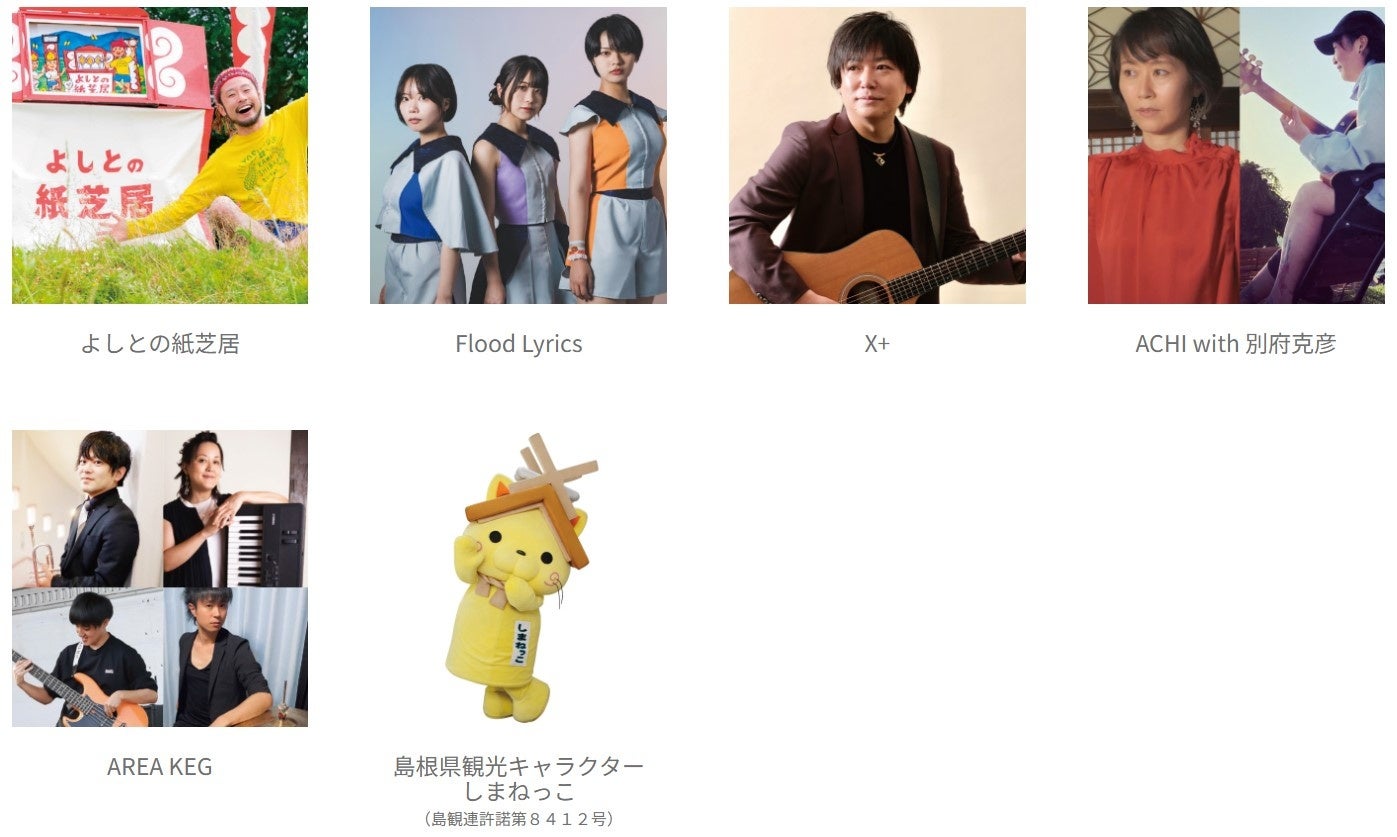 11:30 開場 11:45 オープニング (開会トランペット:テーマソング「上を向いて歩こう」) 12:00 ステージ①「島根県観光キャラクターしまねっこ」 13:00 「お昼のはらぺこ抽選会」日御碕エリア商店で使える商品券が当たる! 13:30 ステージ②「よしとの紙芝居」 14:30 ステージ③「Flood Lyrics」 15:30 「3時のイカ焼き抽選会」日御碕名物イカ焼きなど各種賞品が当たる! 16:00 ステージ④「ACHI with 別府克彦」 17:00 ステージ⑤「X+」 18:00 ステージ⑥「AREA KEG」 19:00 クロージング (閉会トランペット:テーマソング「上を向いて歩こう」) |