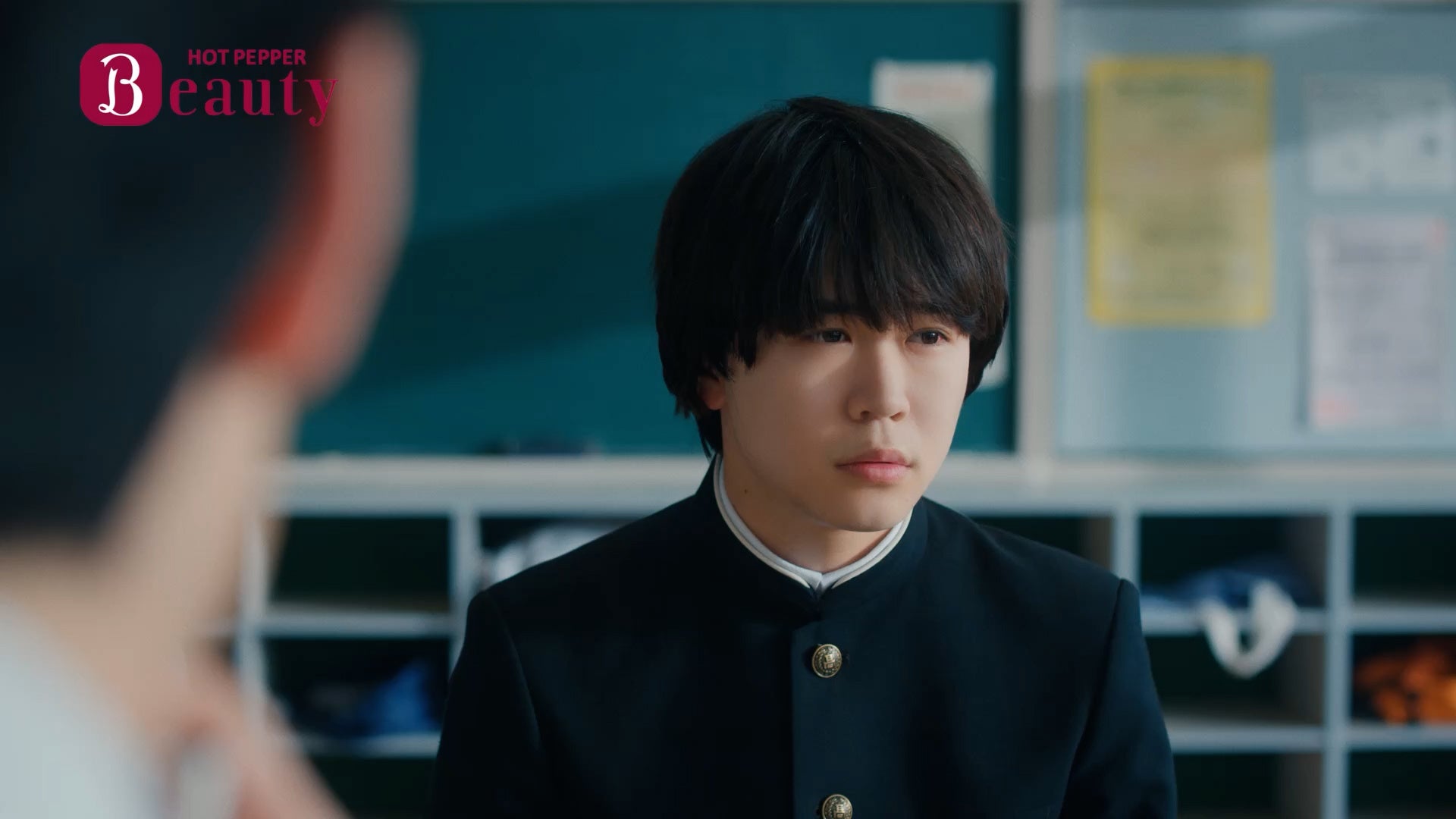 教室の真ん中にレイアウトされた席に着く教師と母親、そして生徒役の鈴木 福さん。今後について相談する三者面談ということで、普段の教室とは違う静かで重たい雰囲気が漂っています。すると教師が二人に対し「息子さん…。頑張ればもうちょっといけると思うんですよね」と切り出します。それを聞いた母親は、まるでこれまでため込んでいた思いを吐き出すように「ですよね!?」と共感。しかし、母親は続けて「頭の形的にサイド抑えてトップの高さ出した方が似合うって!」「センターパートもアリじゃない? 幅狭めのやつ」と、まさかの息子のヘアスタイルについて熱く迫っていきます。たまたま廊下を通りかかった女子生徒と目が合い、福さんはまんざらでもない表情を浮かべます。間髪入れず母親がスマホを手に「美容室行っておいで!『ホットペッパービューティー』で」と勧めたところで、ようやく教師が「志望校の話です…」と分が悪そうに切り出すユーモラスなストーリーとなっています。