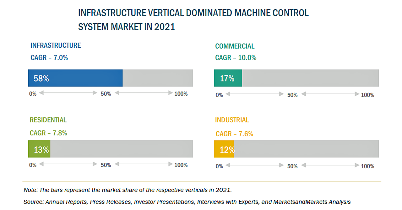 COVID-19パンデミックは、2020年を中心とした建設業界に多大な影響を与えました。世界各地の建設現場は、原材料不足、経済問題、労働力不足などにより、操業停止を余儀なくされました。さらに、ロックダウンが課せられたことにより、進行中の多くのプロジェクトが中止となり、建設業界における機械制御システムの需要に影響を与えました。その後、ロックダウンの解除やワクチンのロールアウトにより、2021年に業界は勢いを取り戻し、速いペースで回復すると予想されています。機械制御システムの需要は、今後、着実に成長すると考えられます。