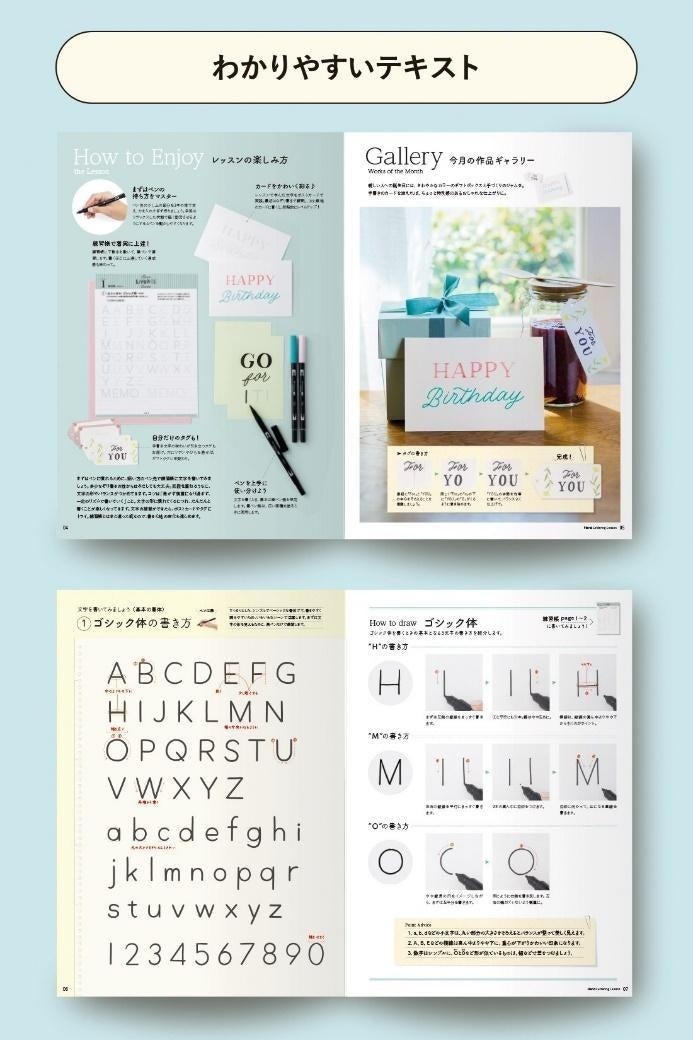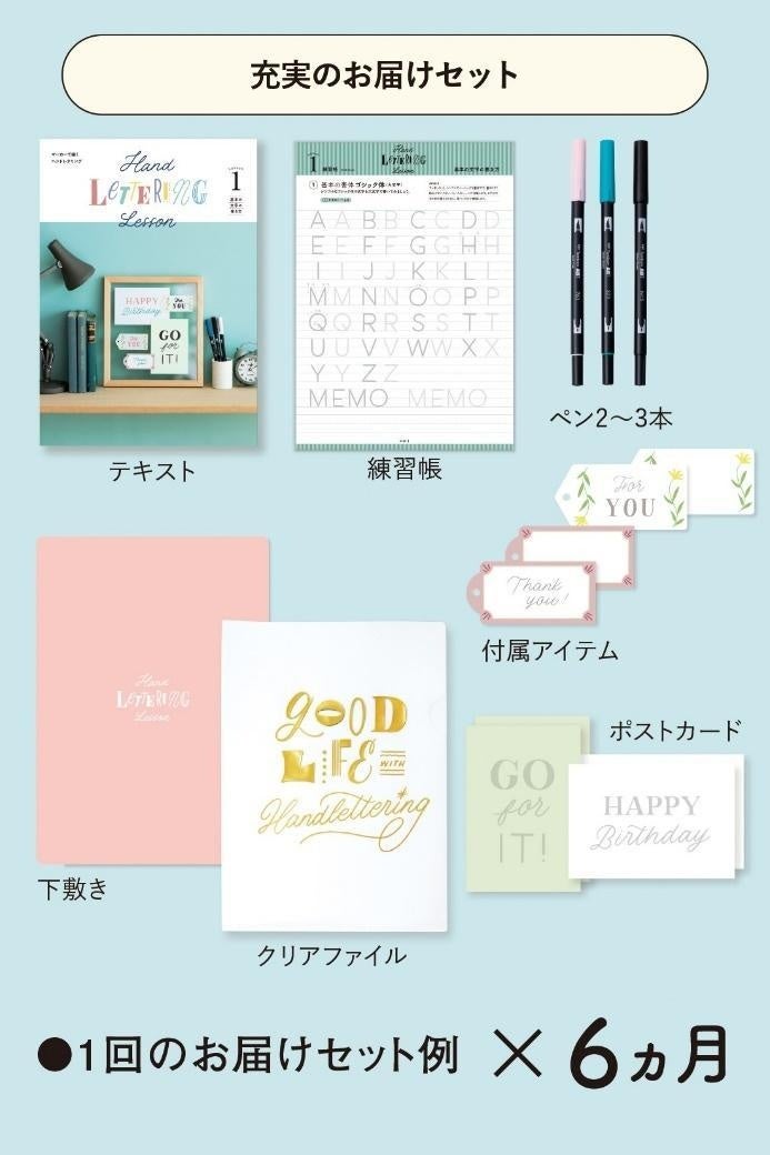 ・セット内容/テキスト1冊(B5版 16ページ)、練習帳1冊(B5版 10ページ)、ペン2~3本、スペシャルカード1枚、ポストカード2種各2枚(最終月除く)、付属アイテム1~4点(お届けする回により異なります)、下敷き・クリアファイル(B5版)各1枚(初回のみお届け)