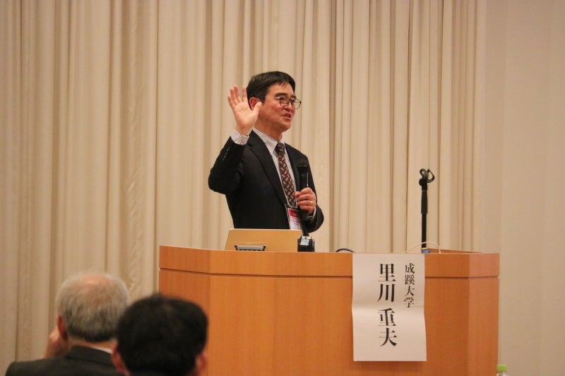 続いて行われた講演では、成蹊大学理工学部の里川重夫教授が「カーボンニュートラルな合成燃料の製造方法と最近の動向」と題し、合成燃料の必要性や製造プロセス、国内外の事業計画などを紹介しました。その中で、日本においては再生可能エネルギーを用いた水素の製造コストが課題となっていることから、地域レベルでの電力グリッド整備の重要性を強調しました。