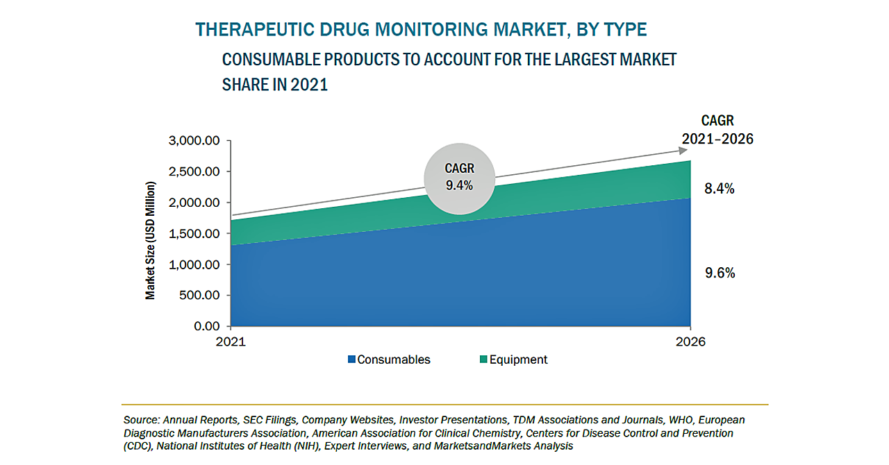 薬物治療モニタリング(TDM)の市場規模は、2020年の16億米ドルからCAGR9.4%で成長し、2026年には27億米ドルに達すると予測されています。同市場の成長は、臓器移植の件数の増加、多くの治療分野でのTDMの使用、精密医療への嗜好の高まり、TDMに関連する研究開発への注目、免疫測定機器の技術的進歩などが主な要因となっています。一方、高額な設備投資が必要であることや、小規模な病院がTDMサービスを提供することに消極的であることが、市場の成長を制限する可能性があります。