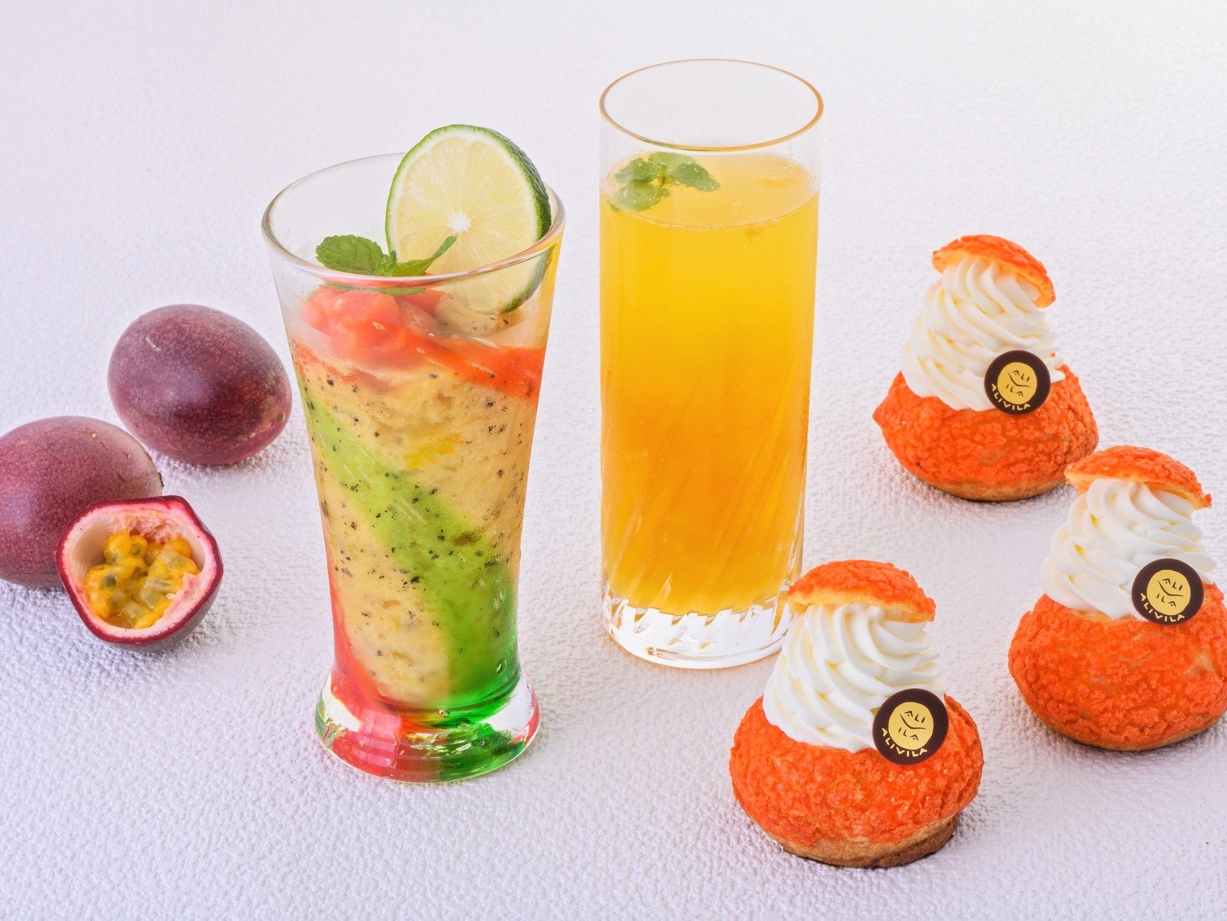 (左)アリビラパッション~パッションフルーツと島バナナのスムージー~ 1,200円 (右)パッション&マンゴーソーダ 1,100円