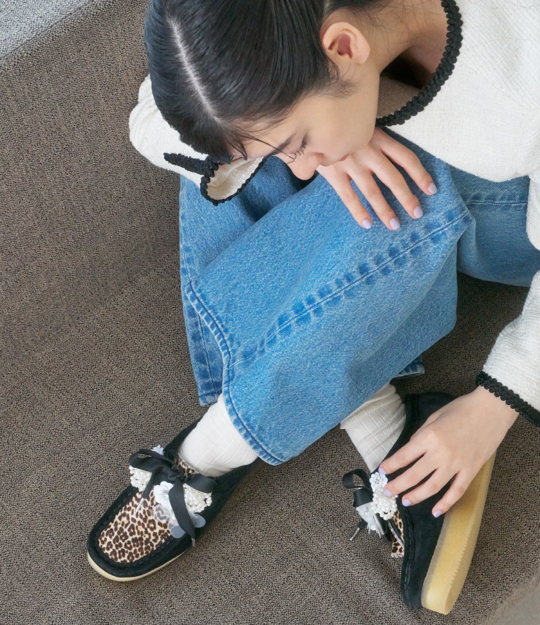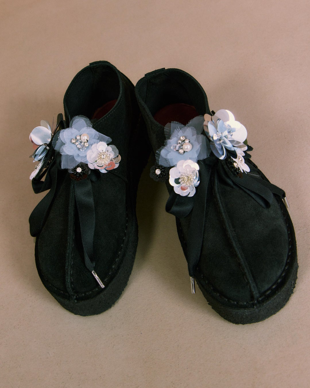 ビジューやパール、オーガンジーのスパンコールを使用したシューアクセサリーや、フラワー型のオリジナルフォブ(飾り札)、サテンのシューレースなどのクラフトパーツでたっぷりとデコレーションし、華やかな足元を演出するカスタムモデルへと仕上げました。