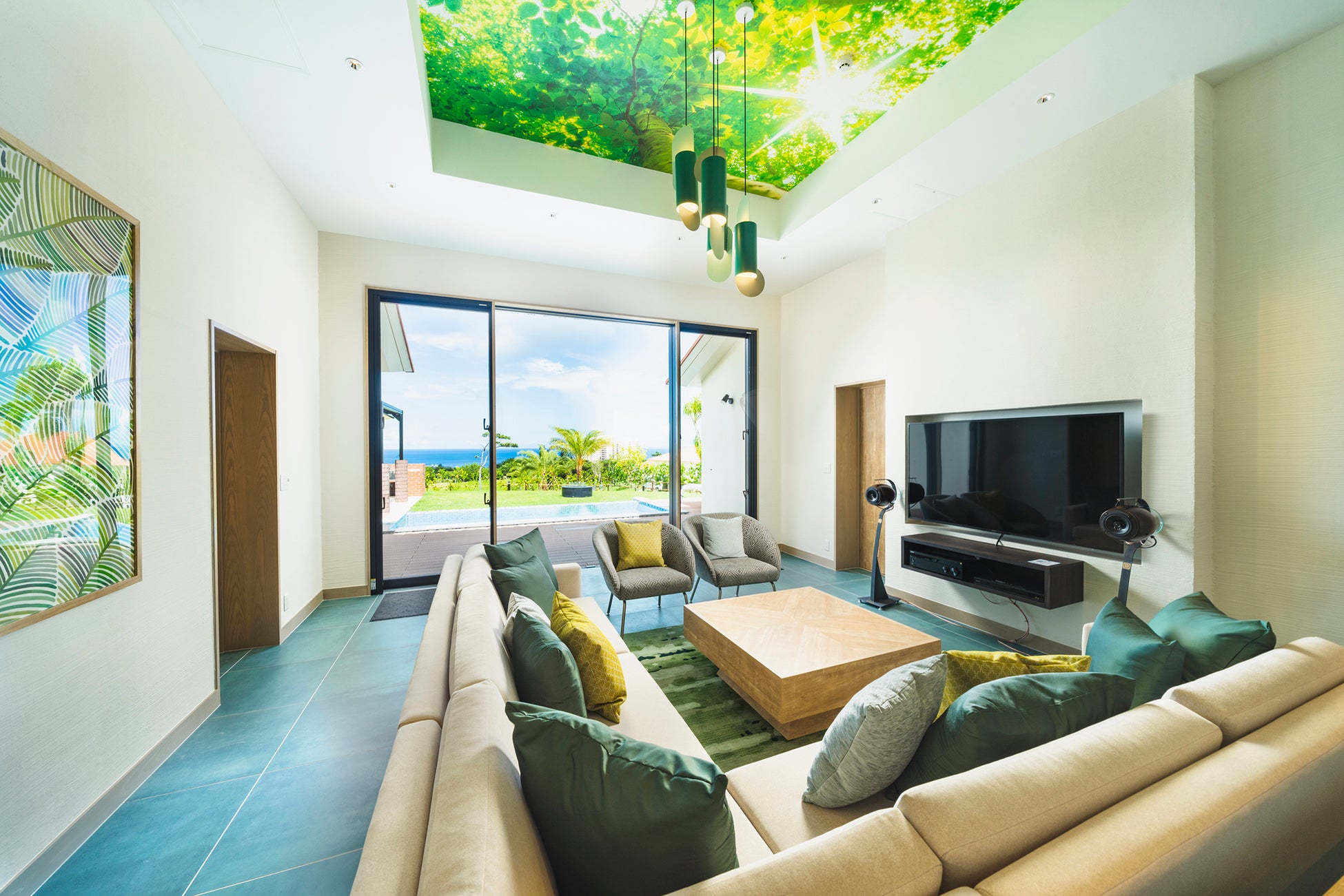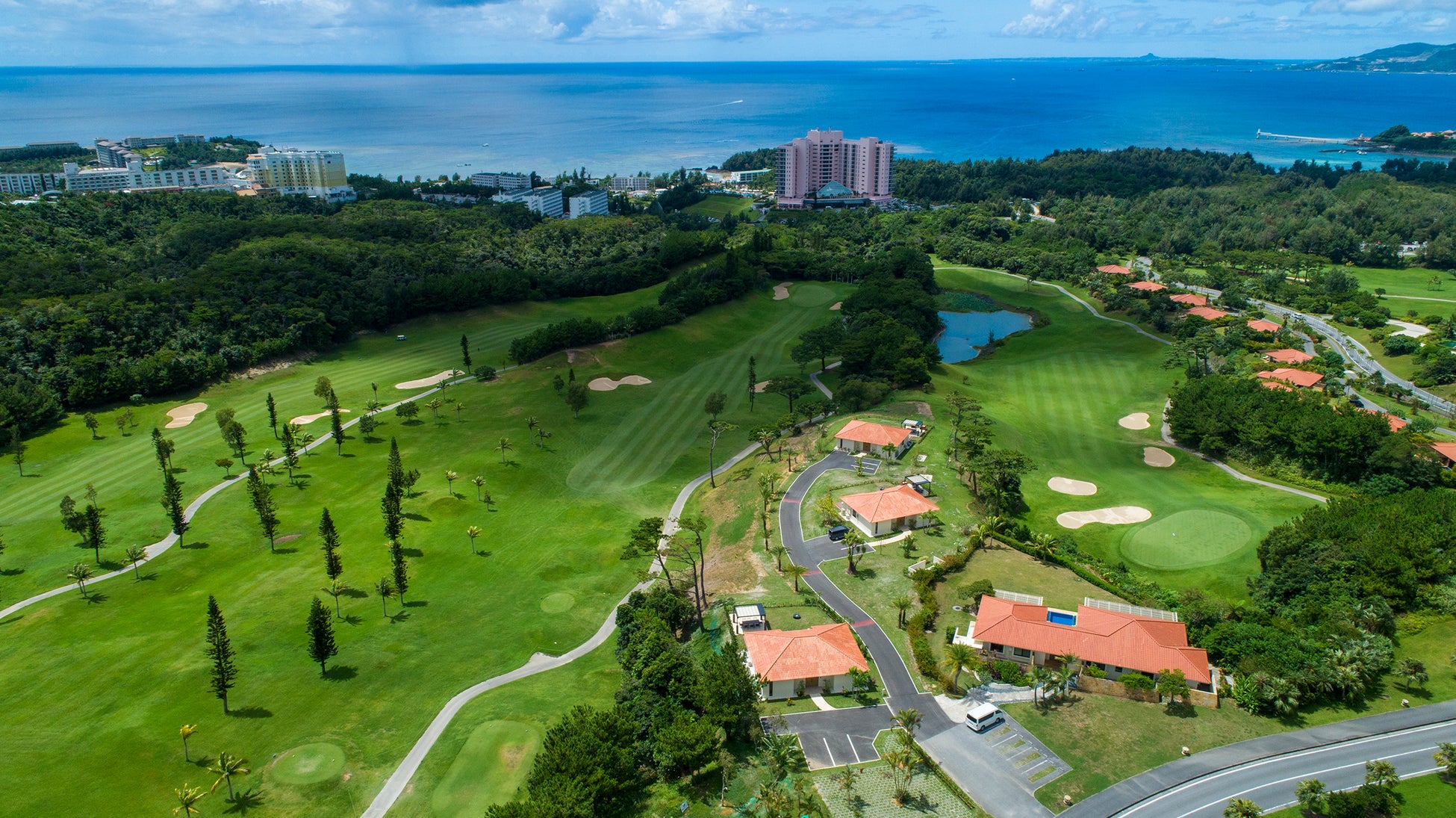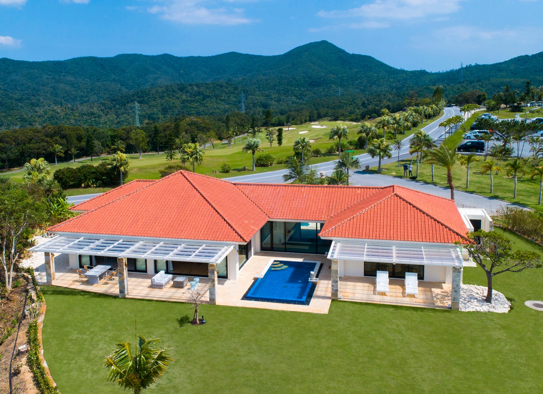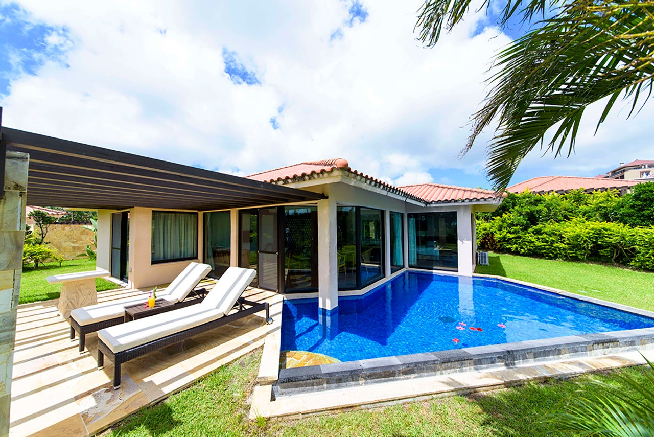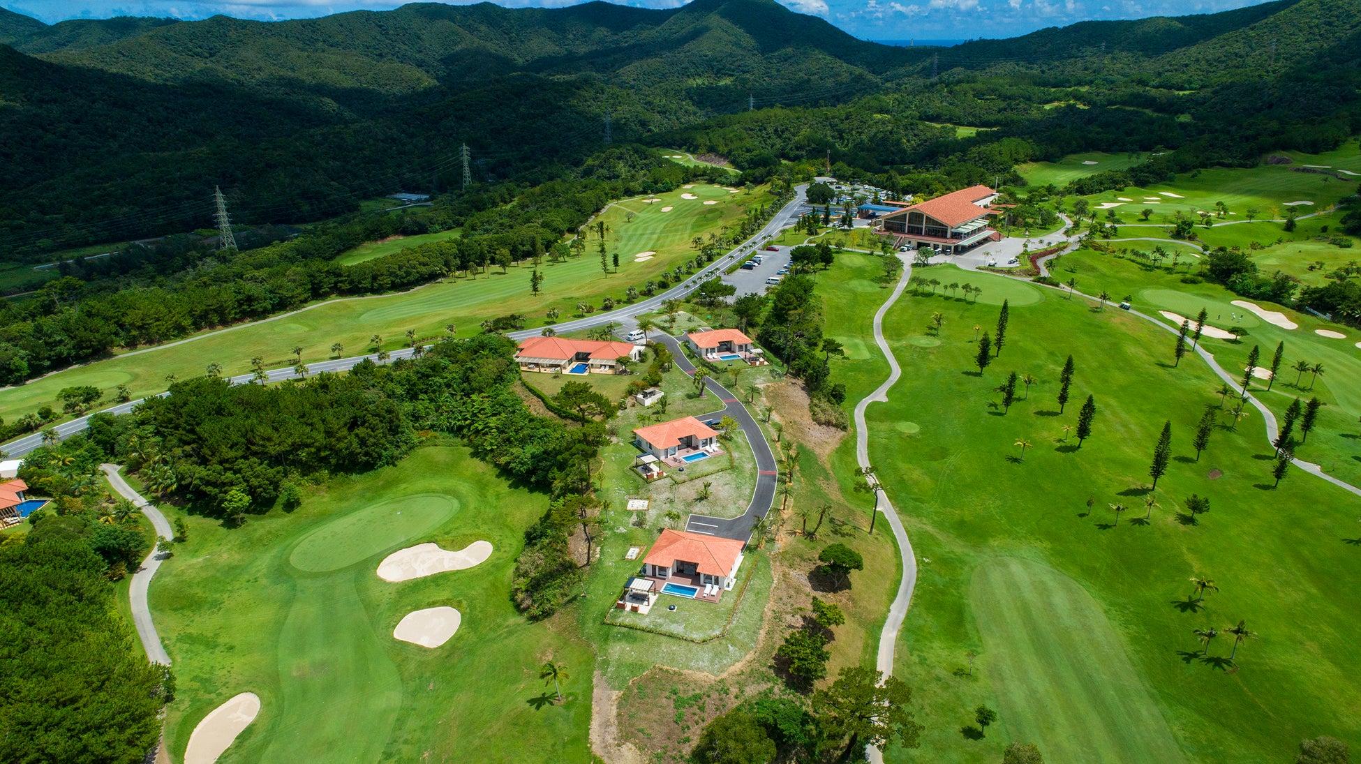 「かねひで喜瀬カントリークラブ」は美しい海とヤンバルの山々に囲まれたコースを有するゴルフリゾートで、敷地内には、定員9名で三世代でのご宿泊も可能な「スイートコテージ JINWA」ほか、「プレミアムコテージ」、「デラックスコテージ」の計3種のコテージが建ち、それぞれプライベートプールを備えています。