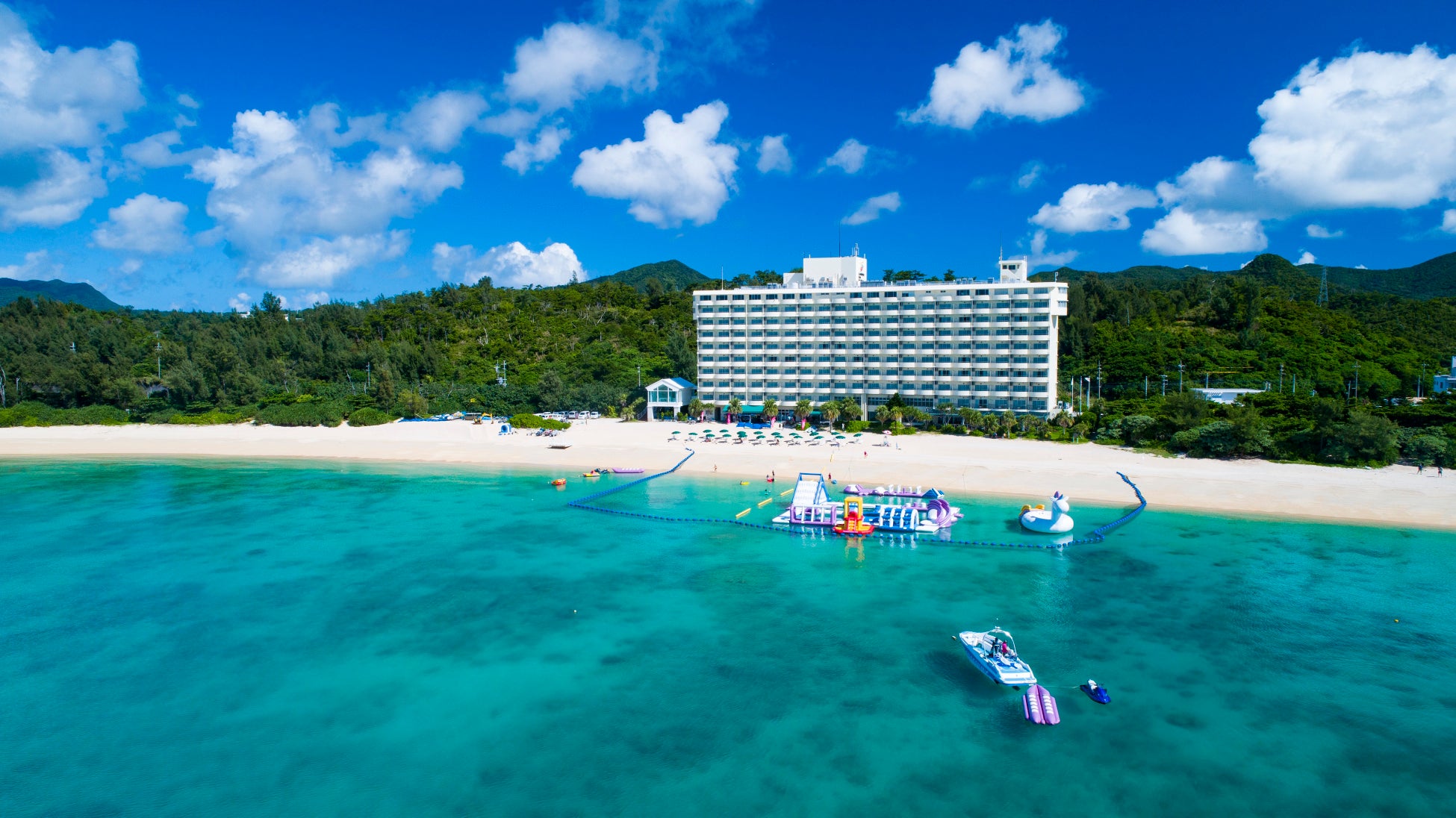 「かねひで喜瀬ビーチパレス」は、レストランや宴会場を備える、全162室のリゾートホテルです。オーシャンビューのお部屋からは名護湾のエメラルドグリーンの海を一望でき、目の前のプライベートビーチまでたったの5秒。多彩なマリンアクティビティが用意されています。