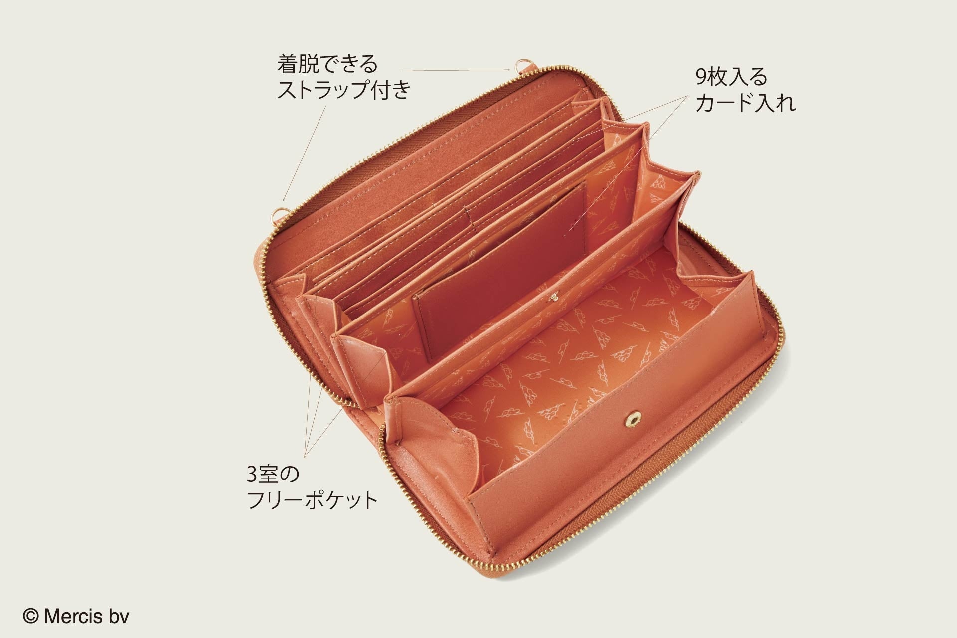 シンプルに持ち運べておしゃれに決まる、人気のストラップ付き長財布の新バージョンです。必要なときにさっと取り出せる便利な外ポケットや、9枚入るカード入れ、3室のフリーポケットなど、機能面も充実しています。デザインは、〈ベージュ〉〈ブルーグレー〉〈テラコッタ〉の3種類です。