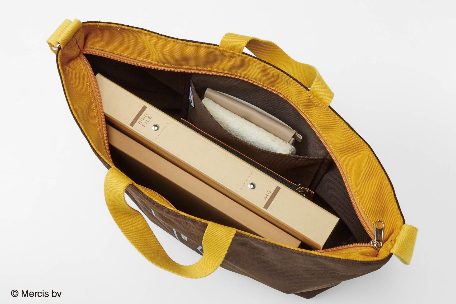 大きめまちが使いやすいトートバッグです。軽い素材でできていて、重さは約360gと、パパイヤ1個分ぐらいで、持ち運びもらくちんです。A4サイズの書類がサッと出し入れできる大きさで、手持ちしやすい長さの持ち手とショルダーバッグでも使える長さのストラップ付きの2-WAY仕様。毎日のコーデや、用途に合わせて便利に使い分けることができます。
