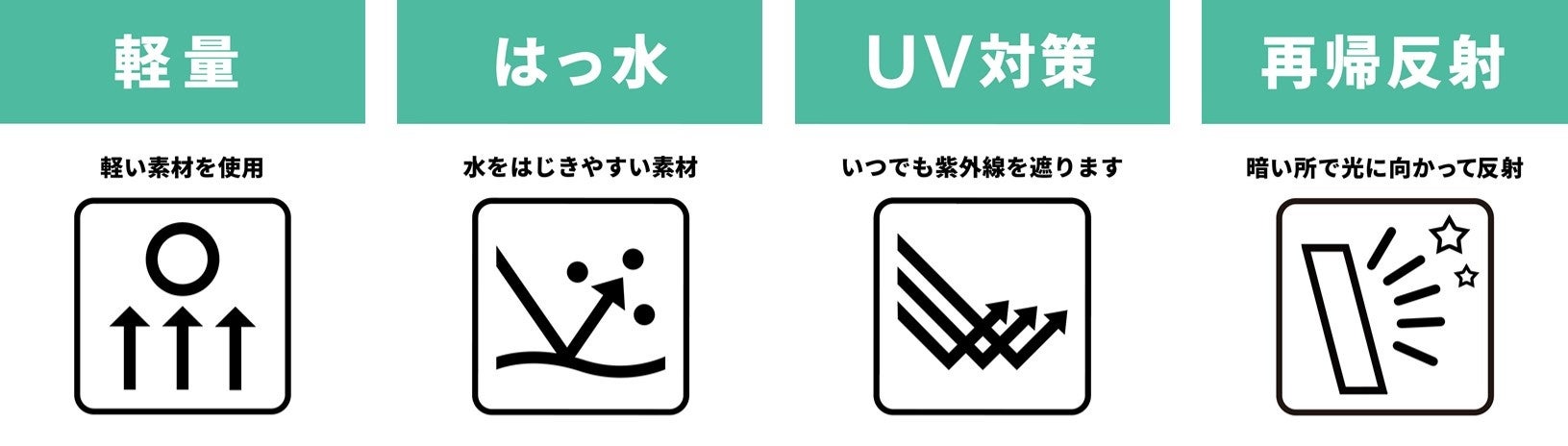 機 能:ポケッタブル、軽量、はっ水、UV対策、反射プリント