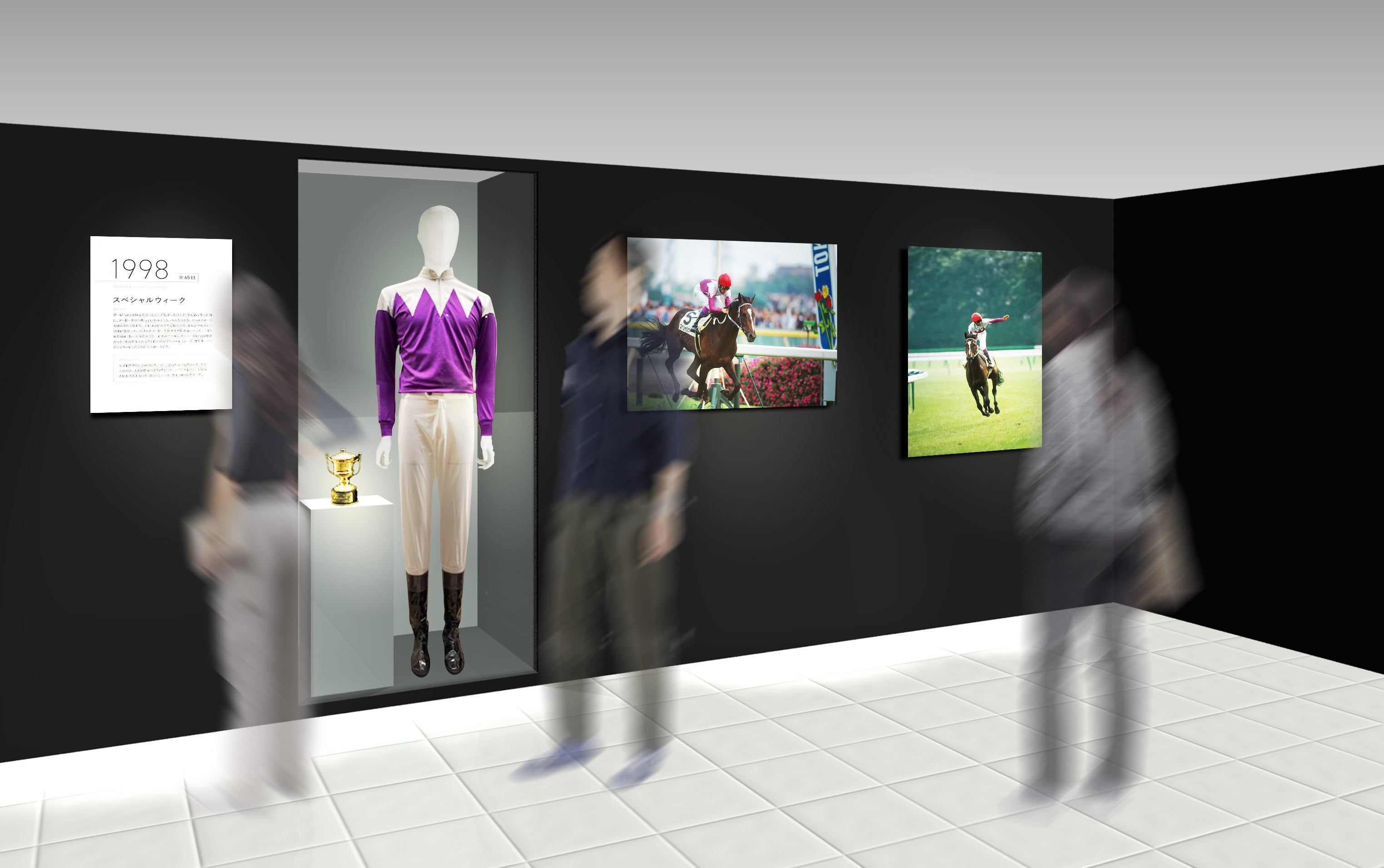 会場では、JRA全優勝GIレースや海外挑戦の雄姿をとらえた写真をはじめ、前人未到の「日本ダービー6勝」の軌跡を辿る特別コーナーをご用意しております。大型写真とともに、優勝カップや勝負服も展示し、栄光の瞬間を間近に感じていただけます。