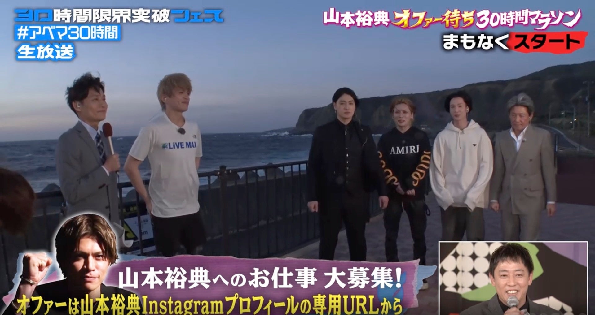 夜6時から、『愛のハイエナ』の看板企画「山本裕典、ホストになる。」で大きな注目を集めてきた俳優の山本裕典が、30時間という長時間の“限界突破マラソン”に挑みながら、リアルタイムで仕事のオファー獲得を目指す『山本裕典 オファー待ち30時間マラソン』に挑戦中です。