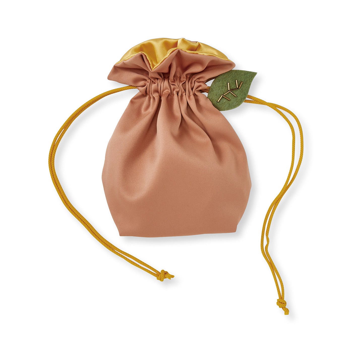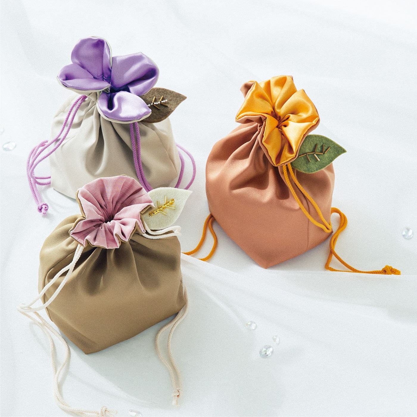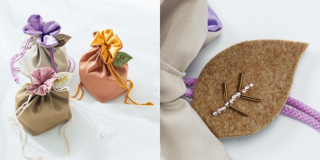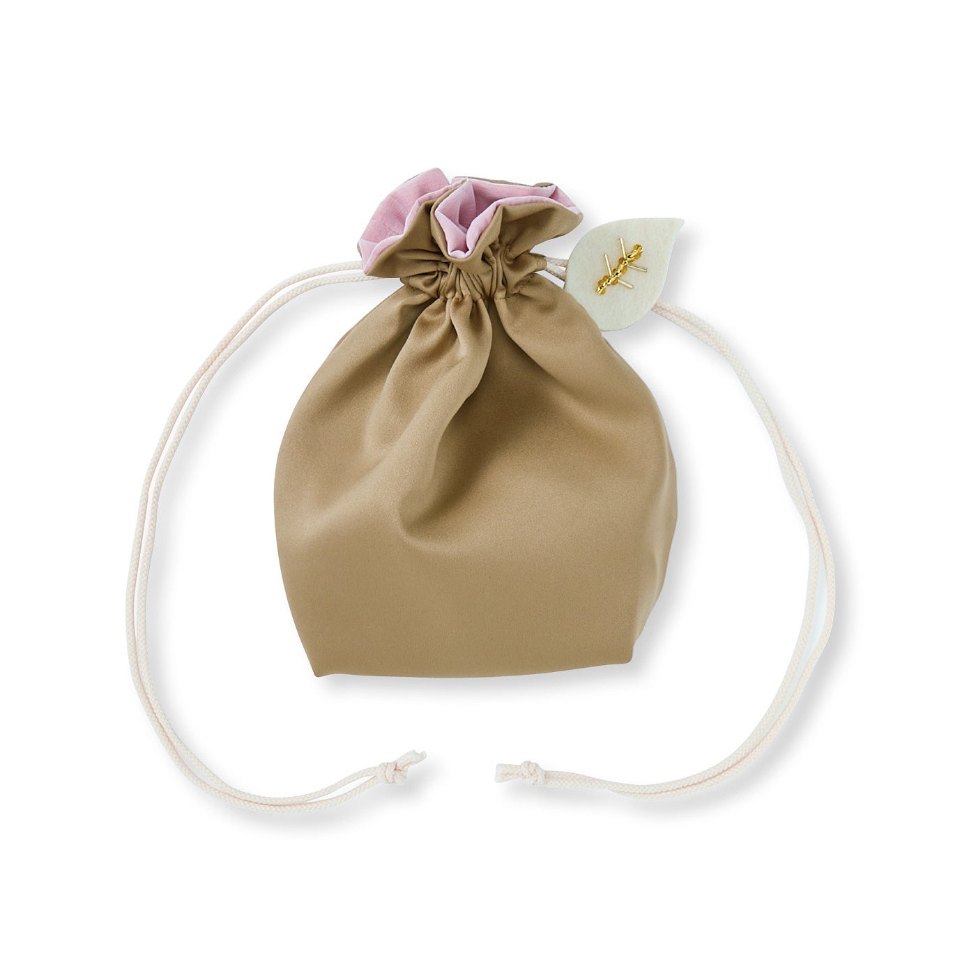 きんちゃくに縫いつけた葉っぱの部分には、きらりと光るビーズの刺しゅうがほどこされています。